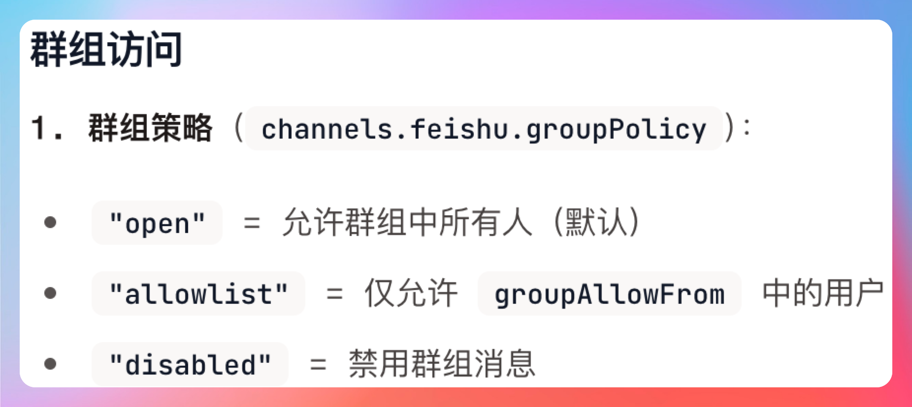 这样当有人在飞书群里@机器人时,飞书会把消息推送到 OpenClaw。