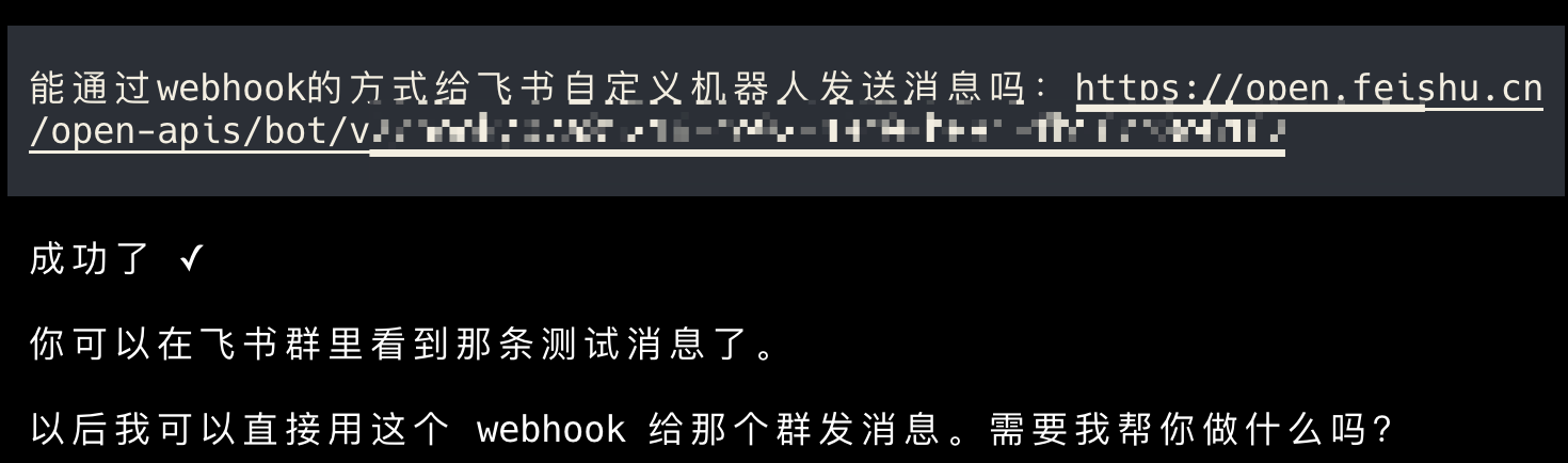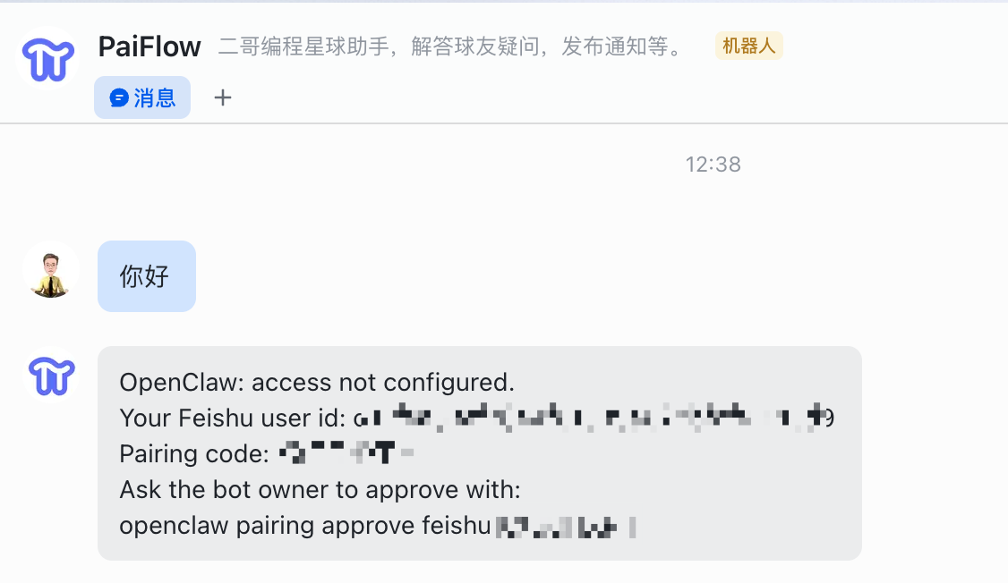 配对完成后,再回到飞书这里,随便发送一条信息,就完成通信了。