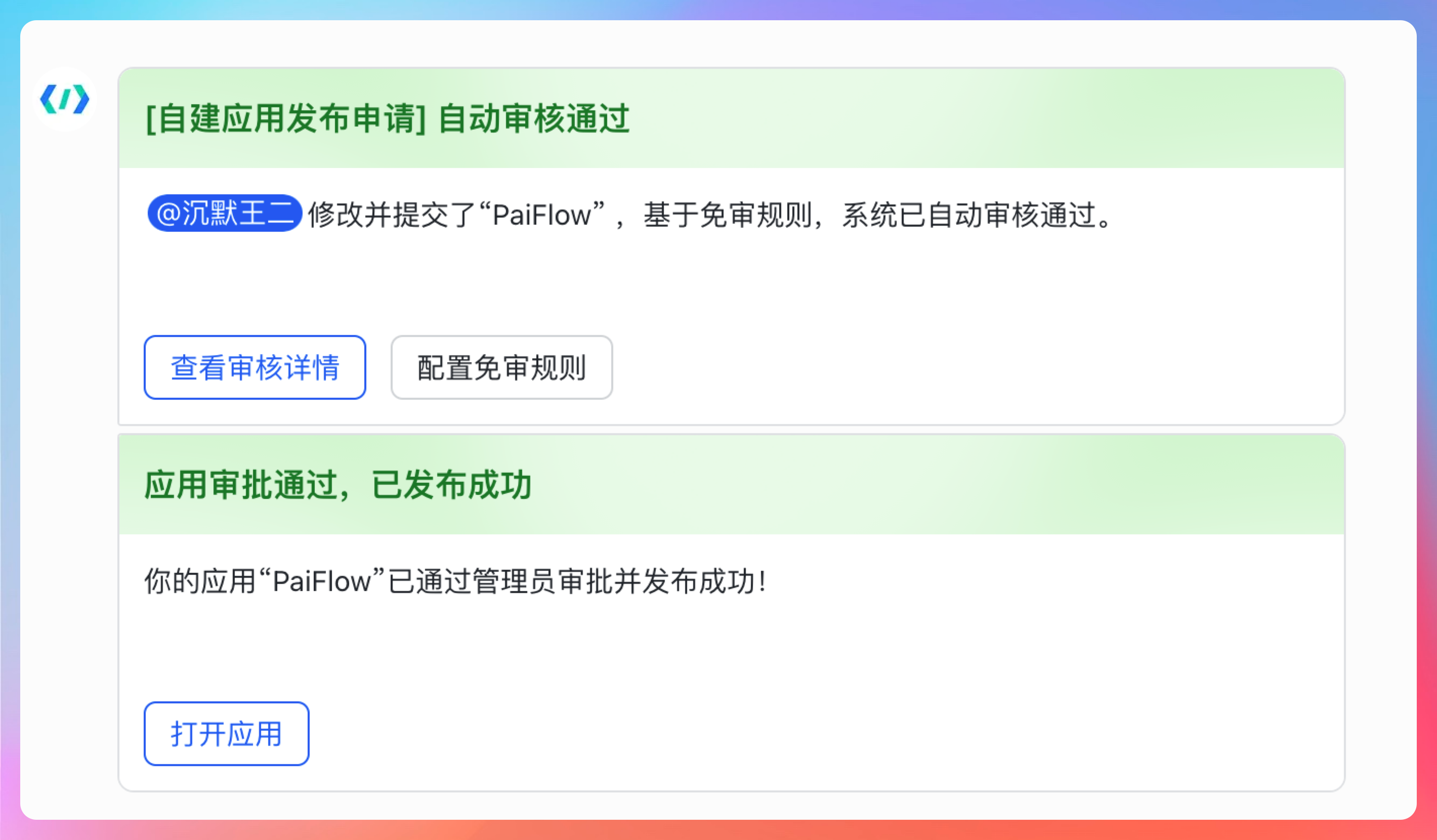 审核通过后(免审,比腾讯的 QQ 和企业微信方便),应用就可以在企业内使用了。