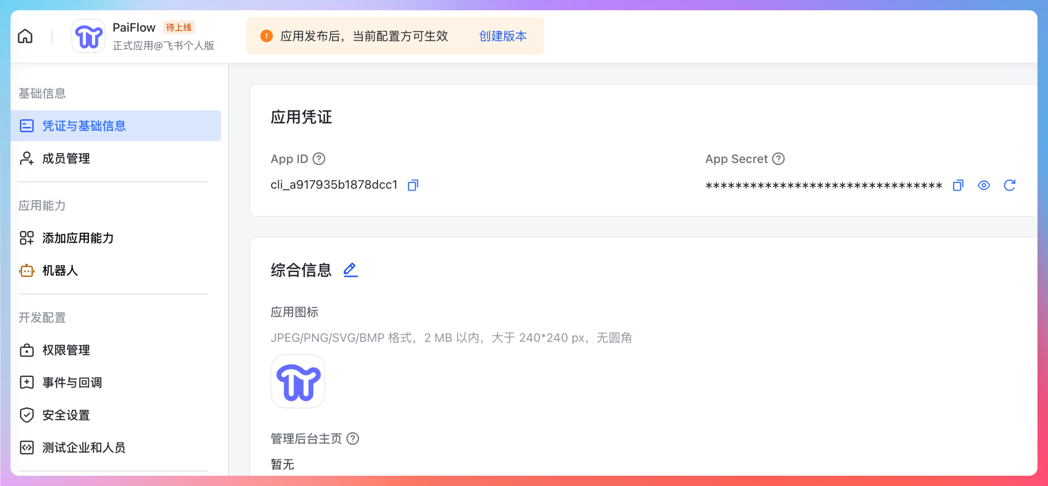 应用创建成功后,在凭证与基础信息页面,你能看到: