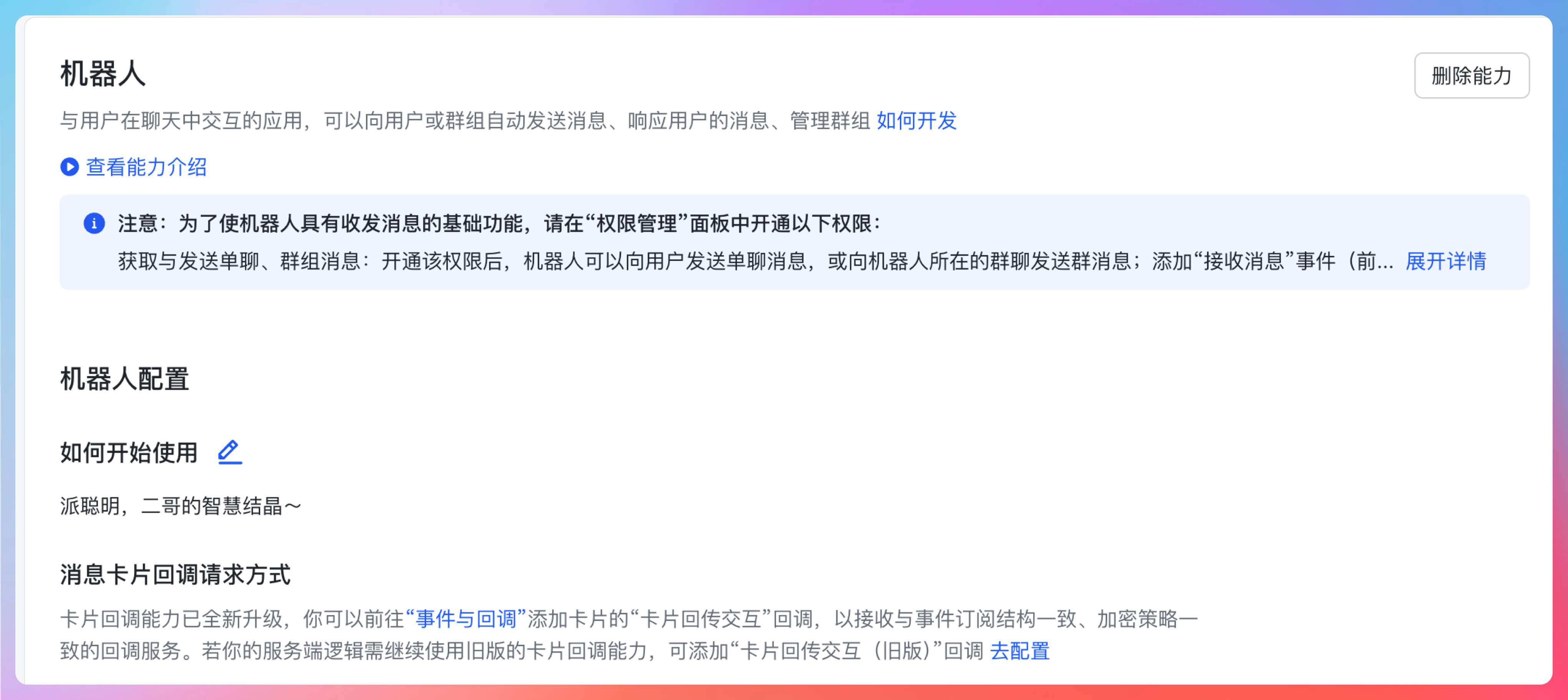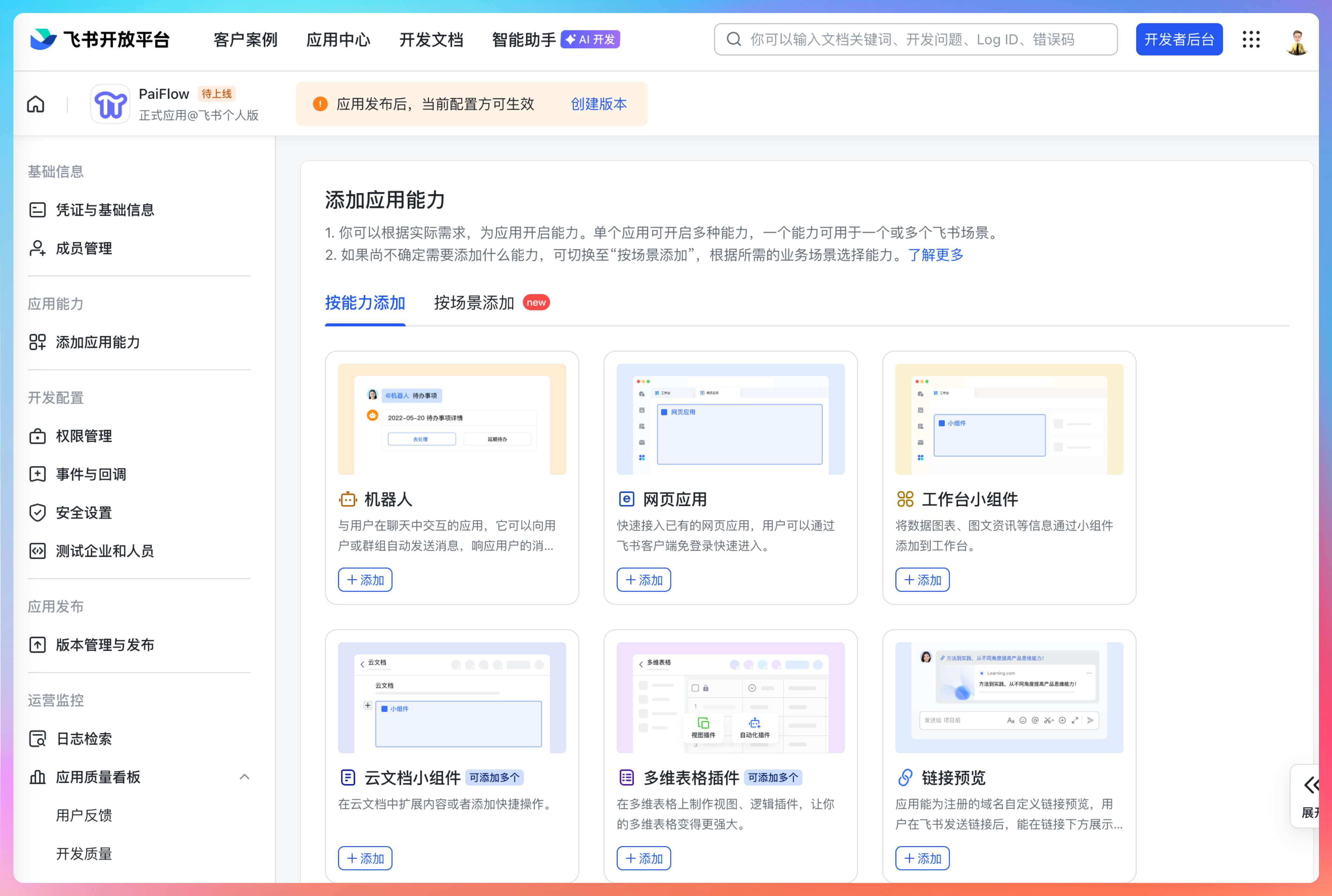 在应用的应用功能页面,点击添加应用能力,选择机器人。开通后,这个应用就能以机器人的身份出现在飞书群里了。