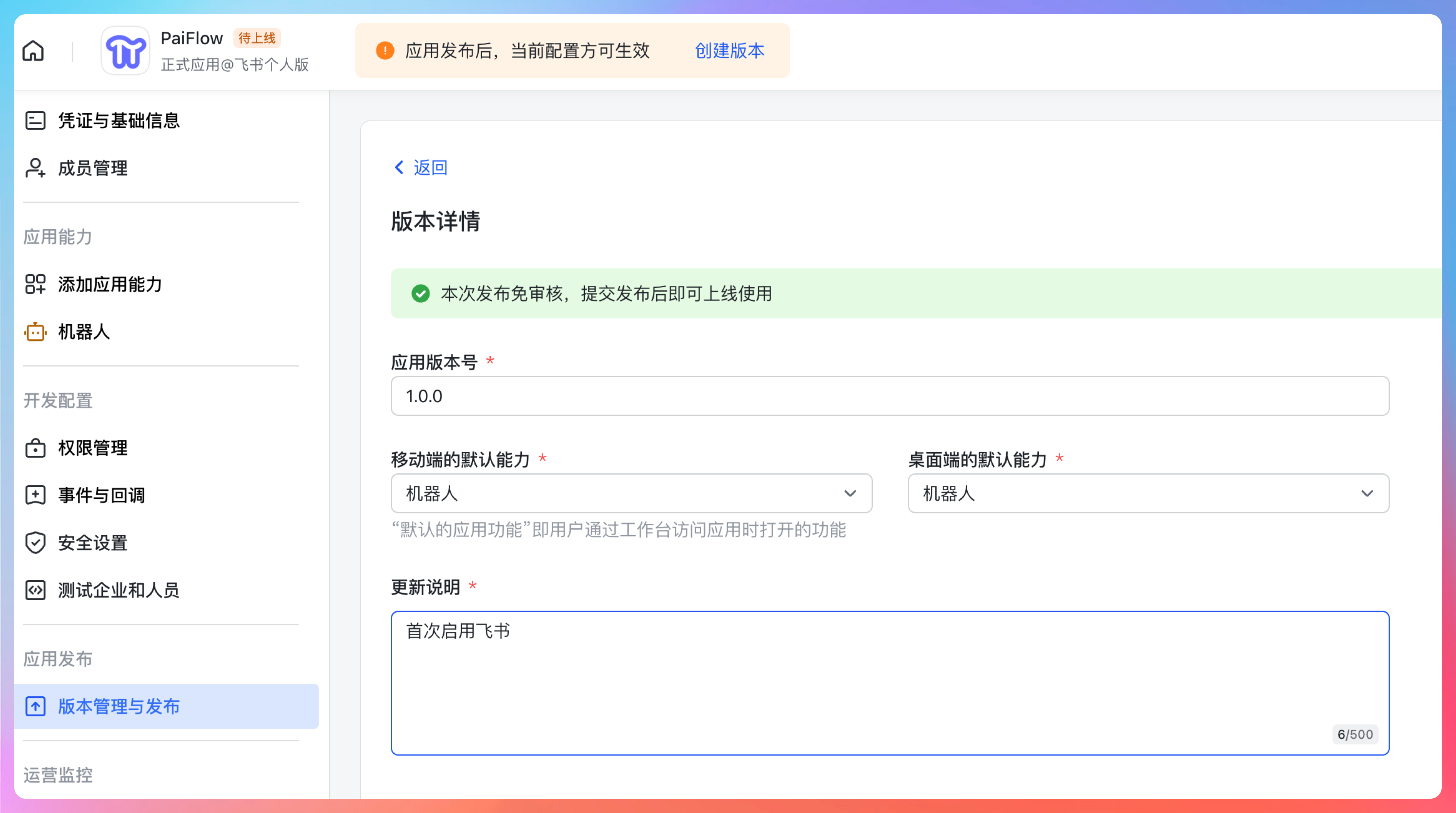 配置完成后,在版本管理与发布页面,创建一个版本并提交审核。