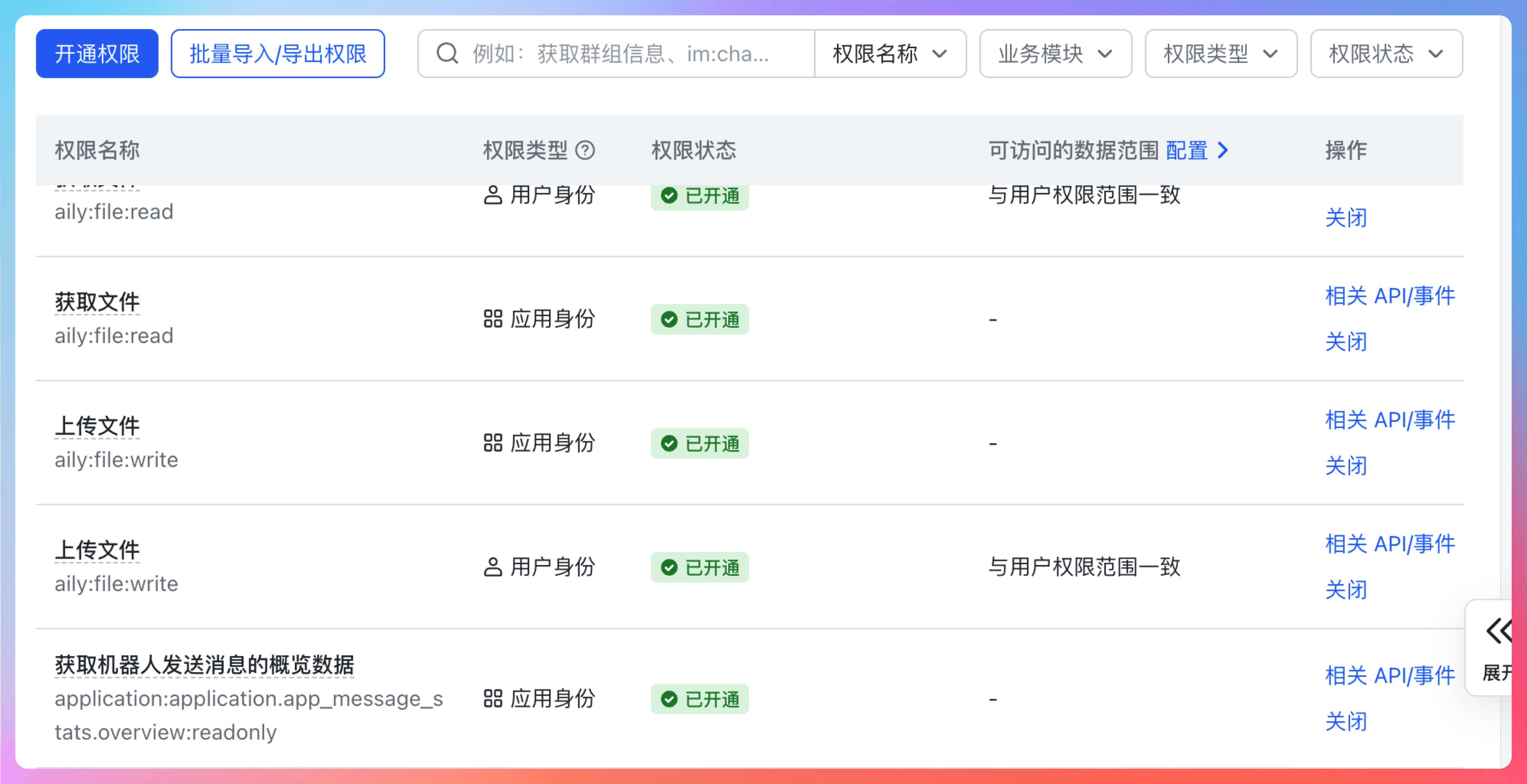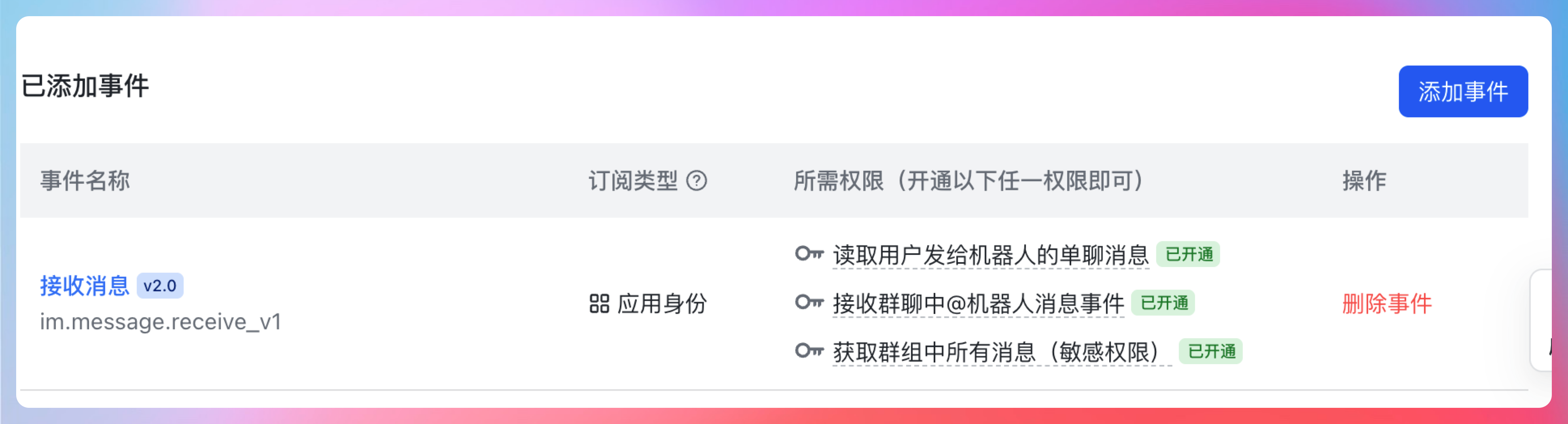 im:message:获取与发送单聊、群聊消息im:message:send_as_bot:以应用身份发消息im:chat:获取群组信息im:chat:readonly:读取群组信息