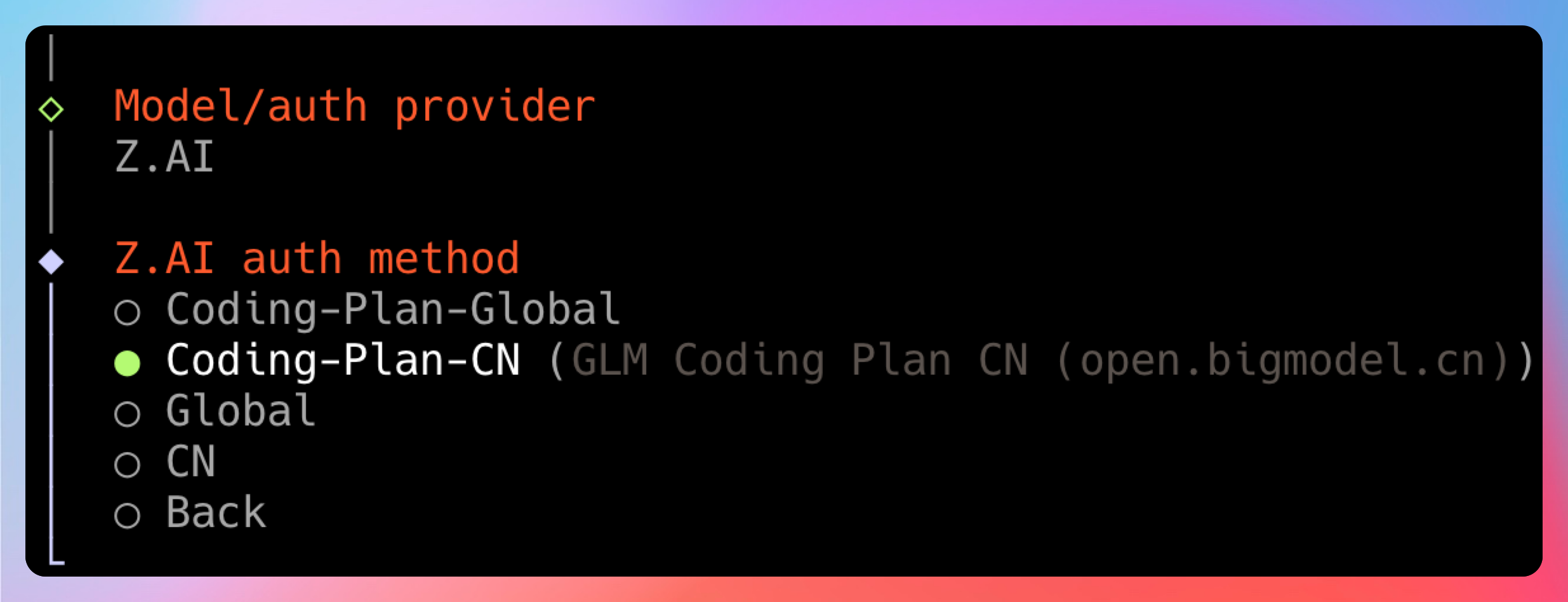 我这里选择 Z.AI 就是智谱。这里选择国内的 plan 套餐。