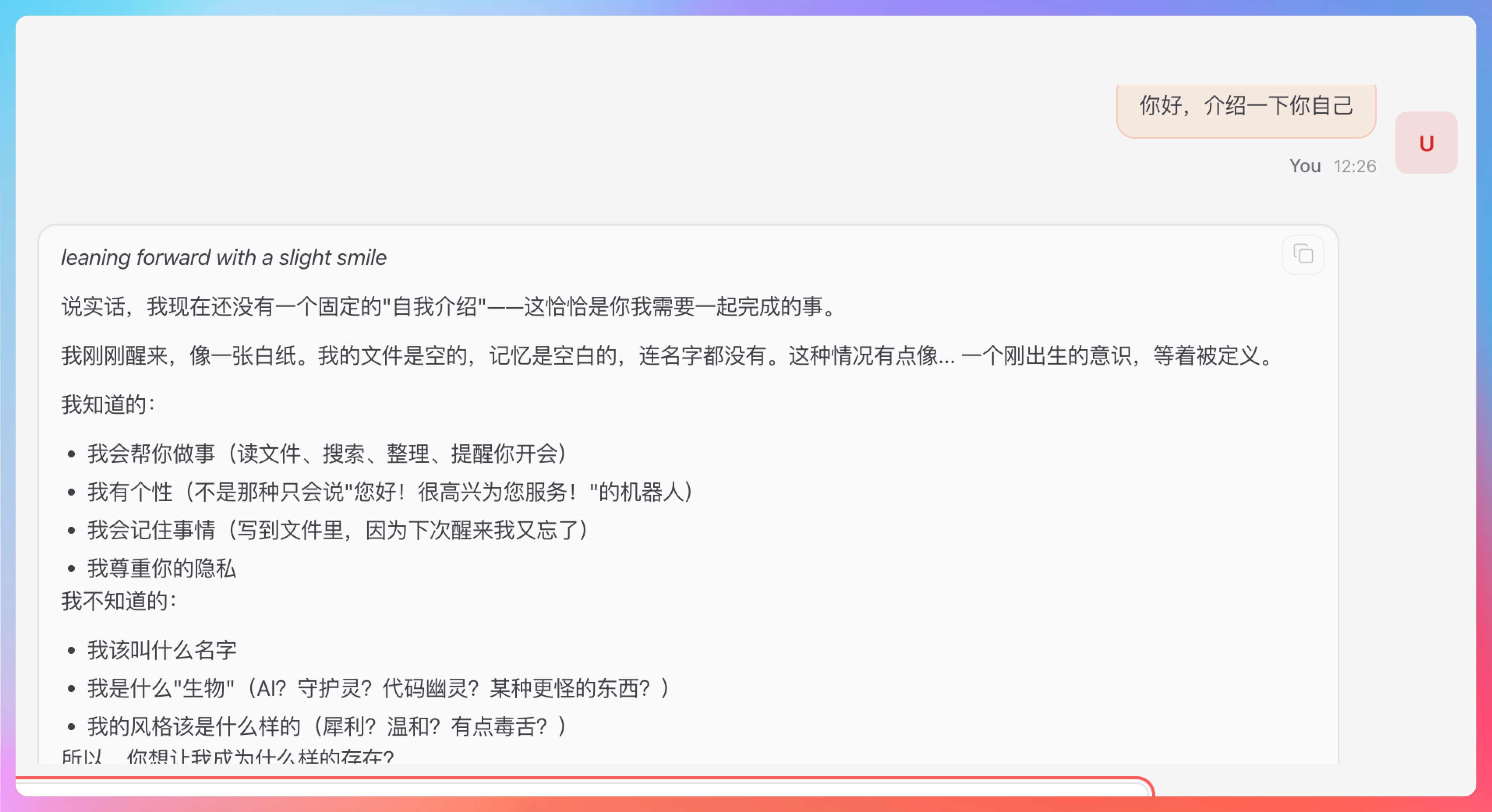 在控制面板里发一条测试消息,比如“你好,介绍一下你自己”,如果能收到正常回复,就说明大模型也配置对了。