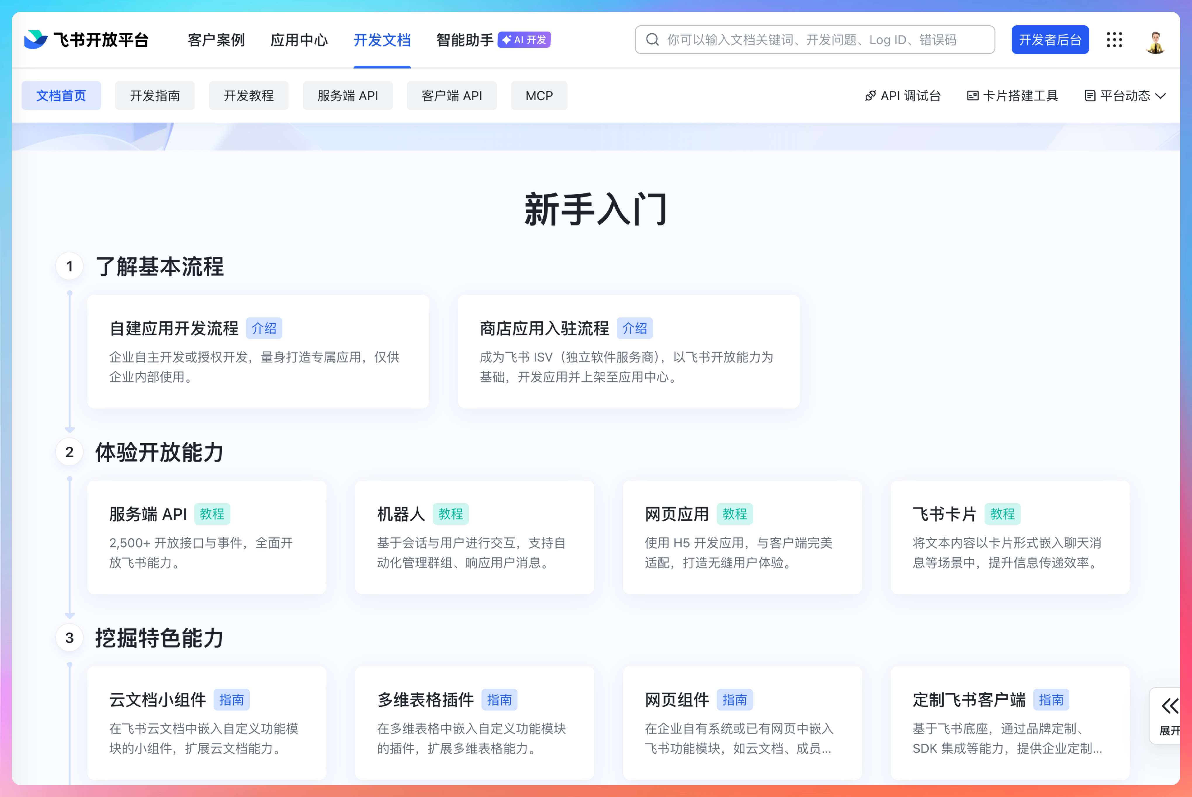 好,进入飞书开发平台 https://open.feishu.cn/document/home/index,可以过一眼基本的流程文档。
