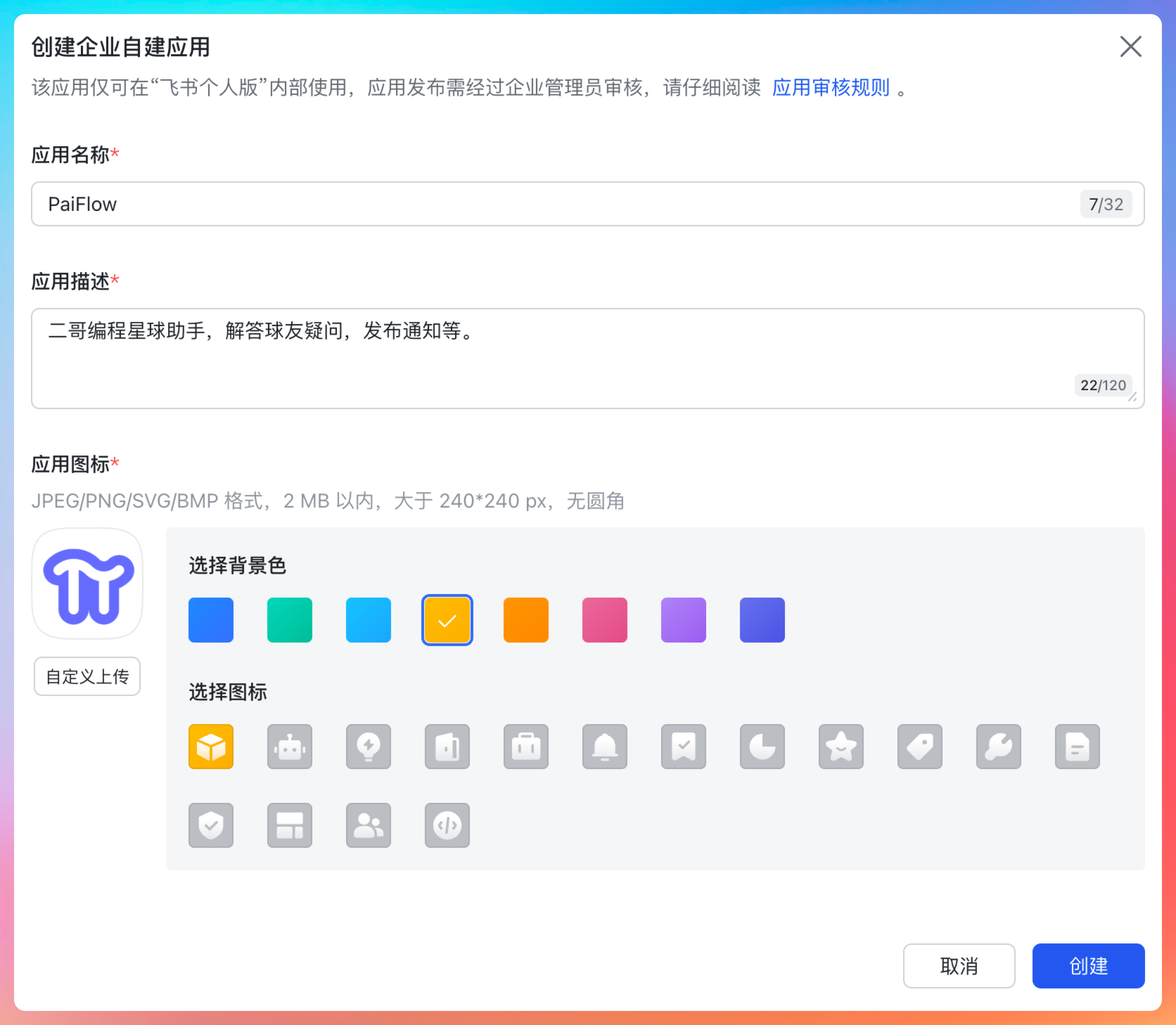 创建一个应用,名字就暂时教 PaiFlow 吧。