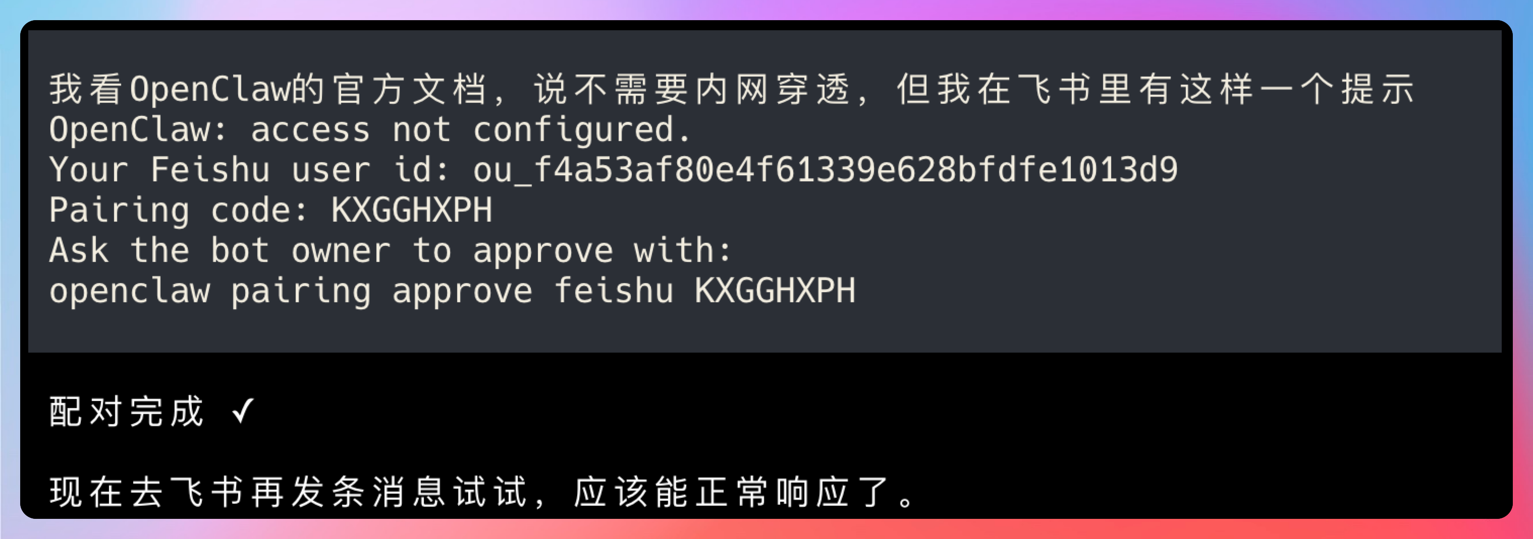 首次会提示你要配对,直接把这条消息发送到 OpenClaw 聊天窗口。