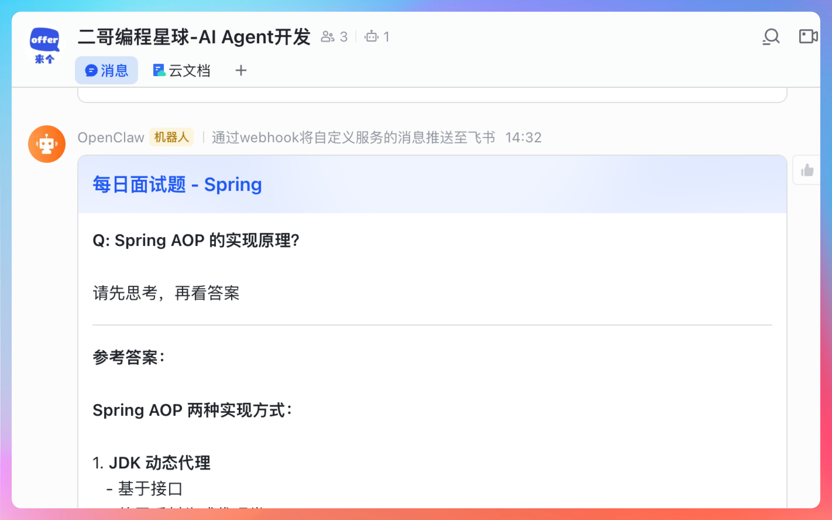 你在飞书里说帮我整理一下今天的待办事项,它就会乖乖去执行。