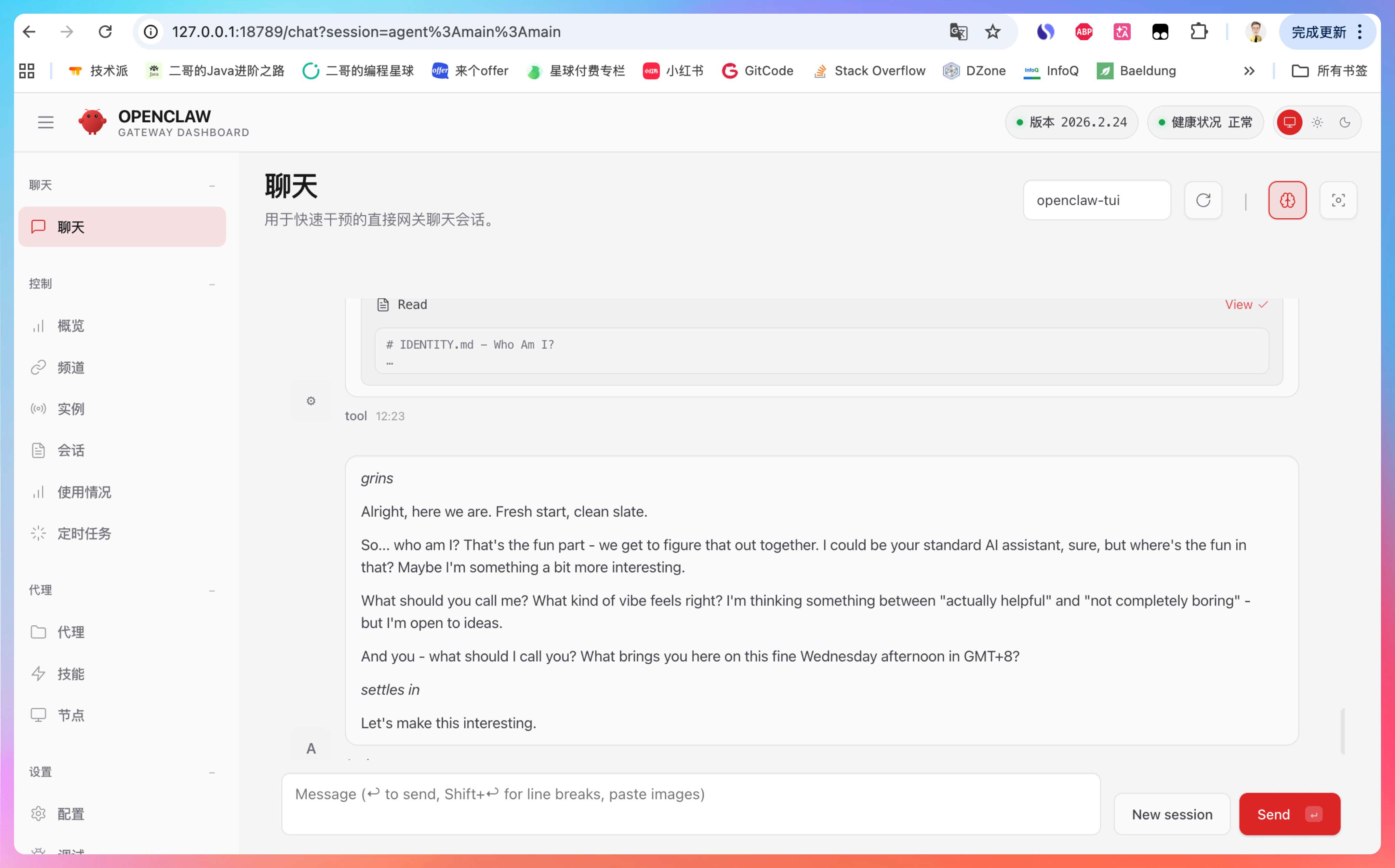 浏览器访问 http://127.0.0.1:18789/,如果能打开 OpenClaw 的 Web 控制面板,说明本地部署成功了。
