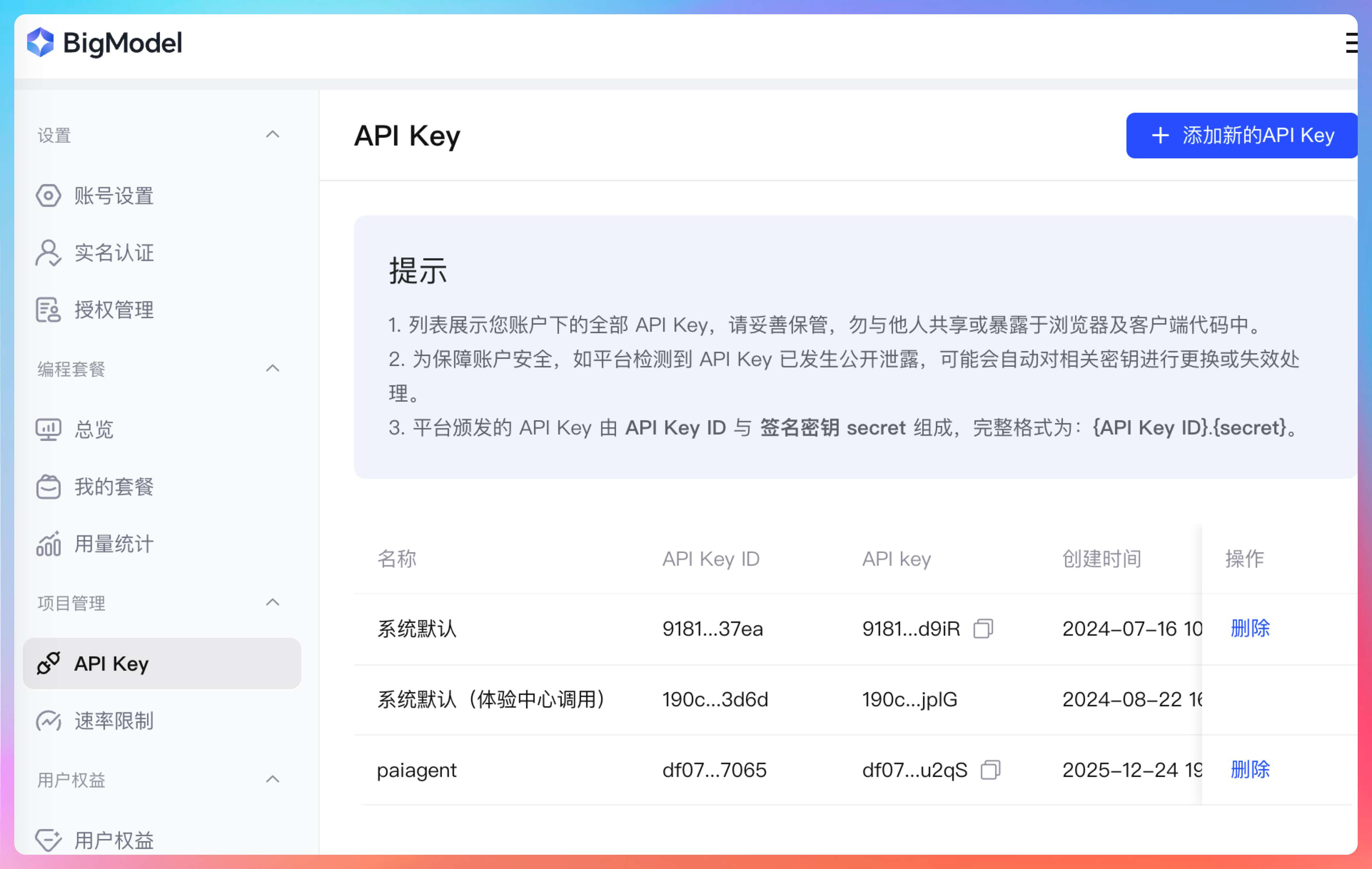购买后访问智谱开放平台,登录后在 API Keys 页面创建一个 Key,复制保存好。