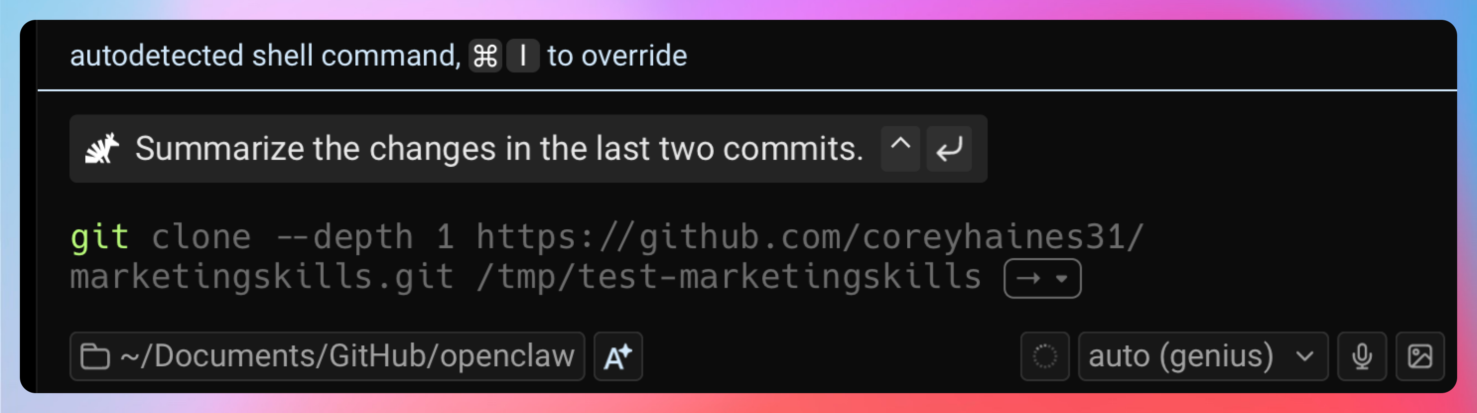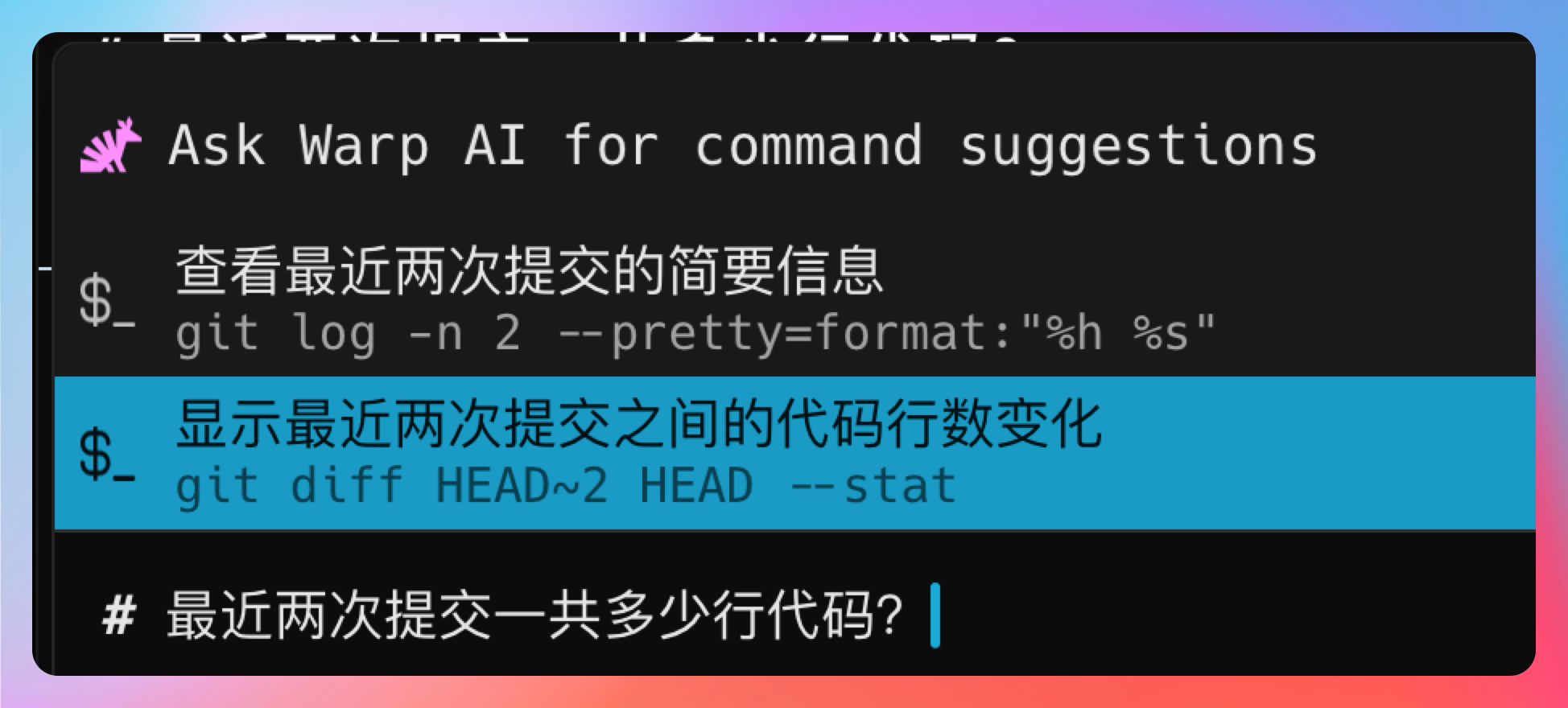 Warp 的 AI 会直接给你生成对应的命令: