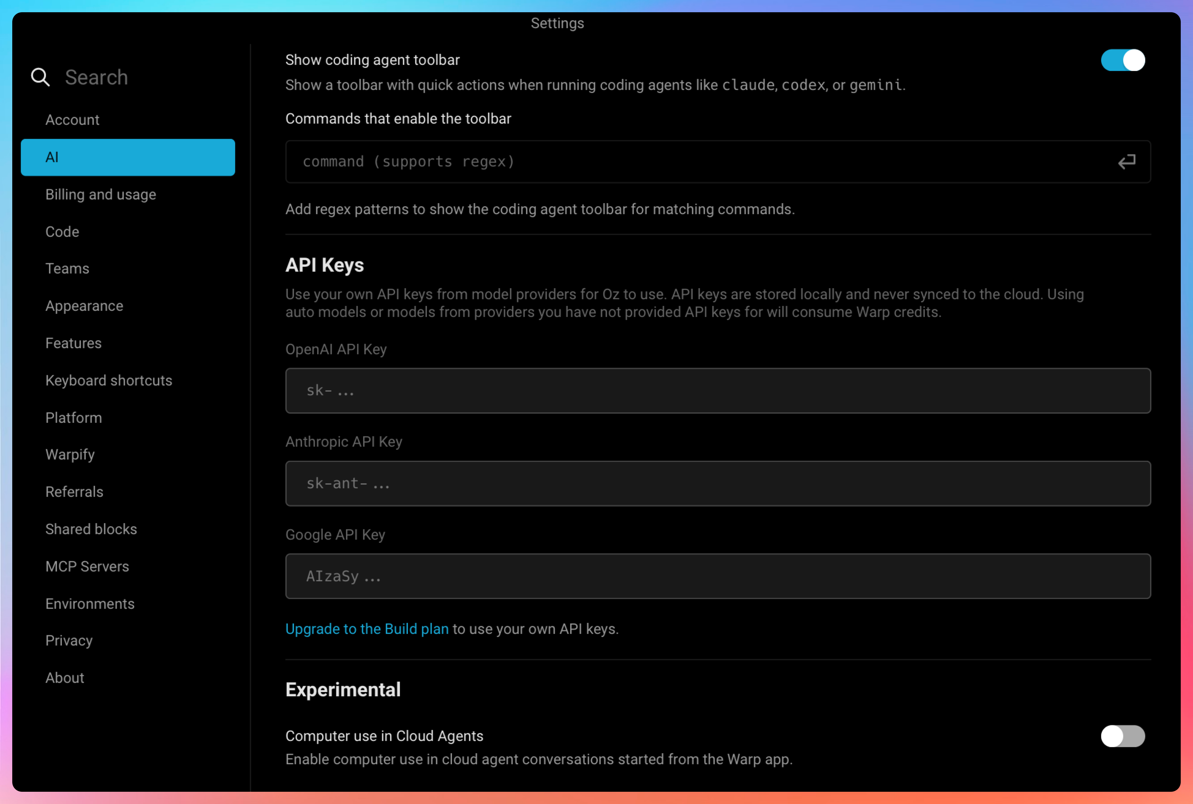 当然了,Warp 自带的 Agent 模式是有额度限制的,并且目前的版本还不支持配置其他模型的 API,除非你开通会员。