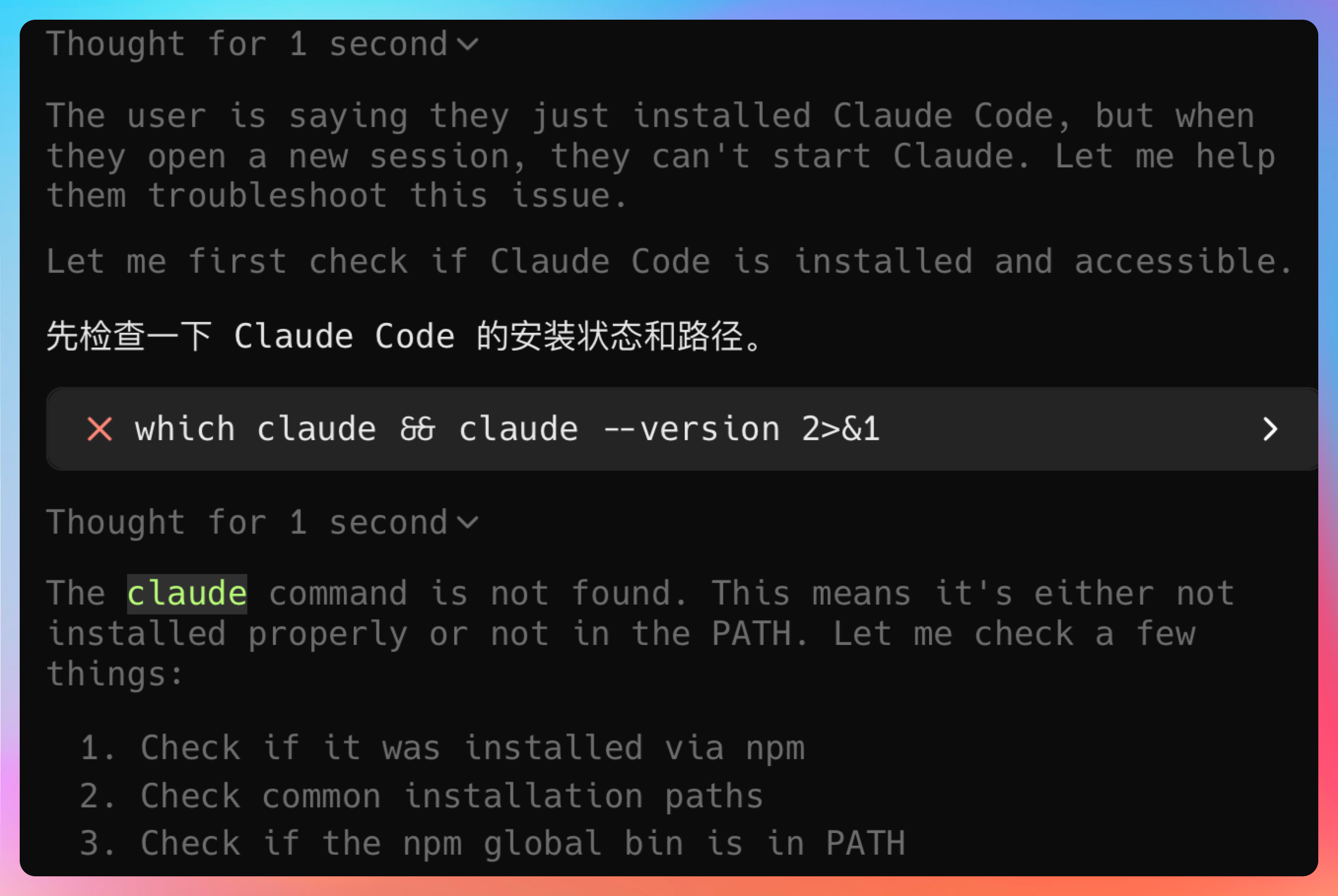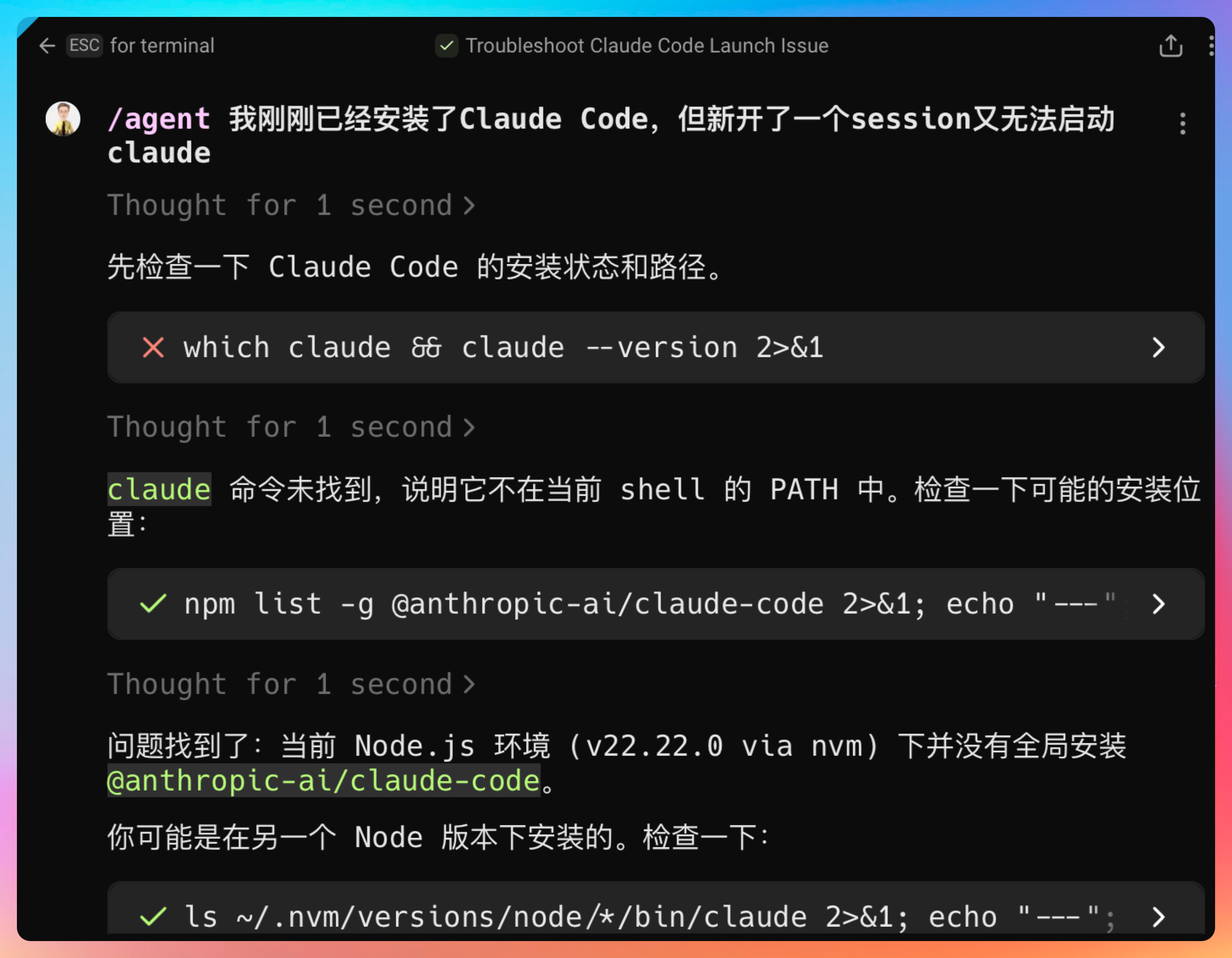 我刚刚已经安装了 Claude Code,但新开了一个 session 又无法启动 claude