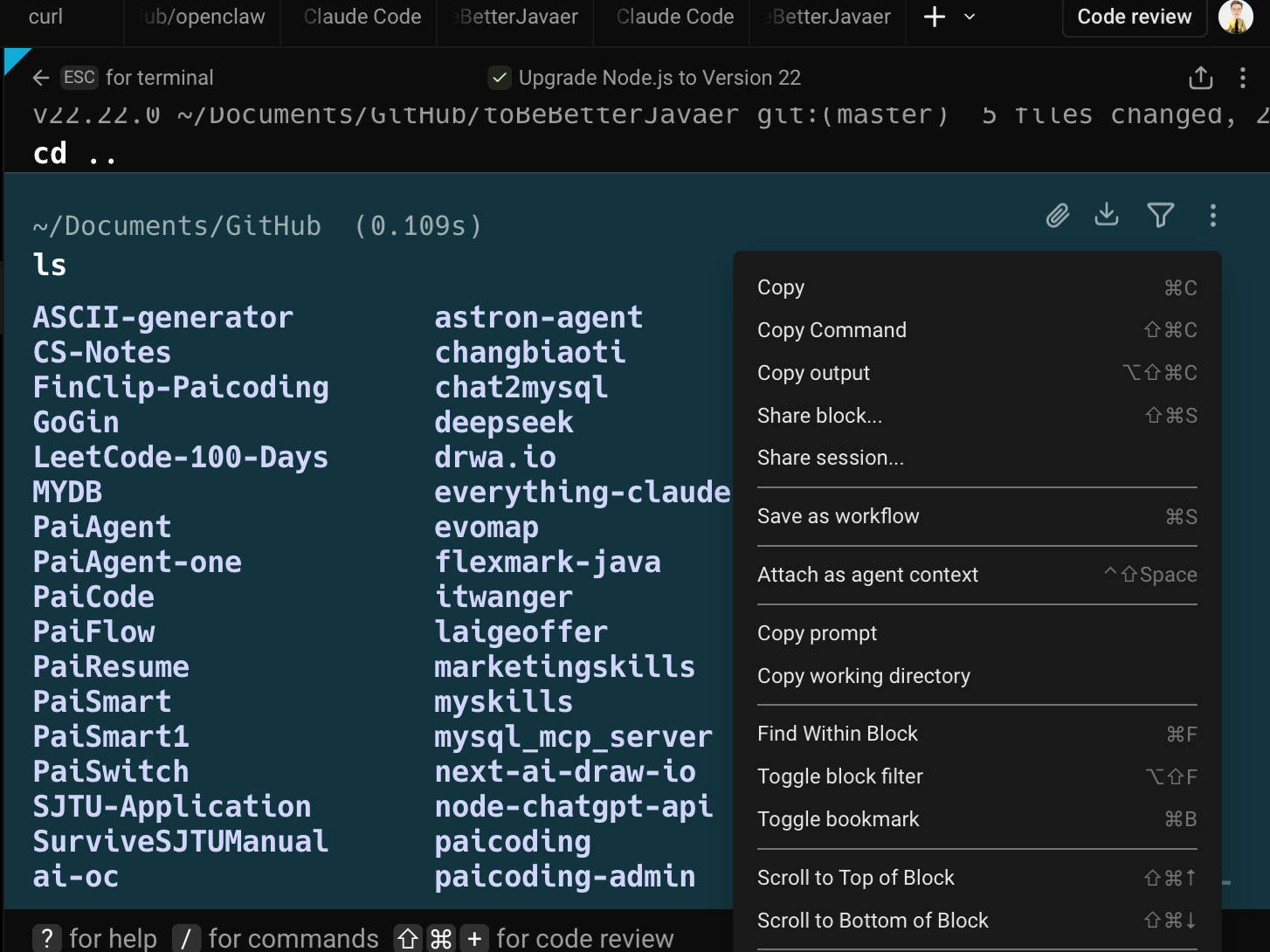 特别是当你用 Claude Code 生成了大段代码,想要复制到编辑器里的时候,你会发现,Warp 帮你省了很多事。