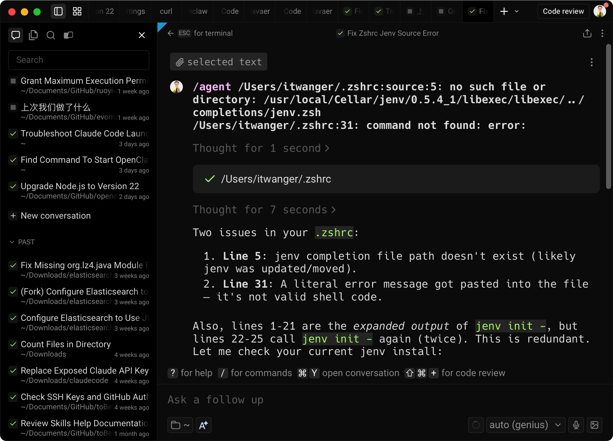 Warp 就会自动切换到 Agent 模式去思考,并帮你解决问题。