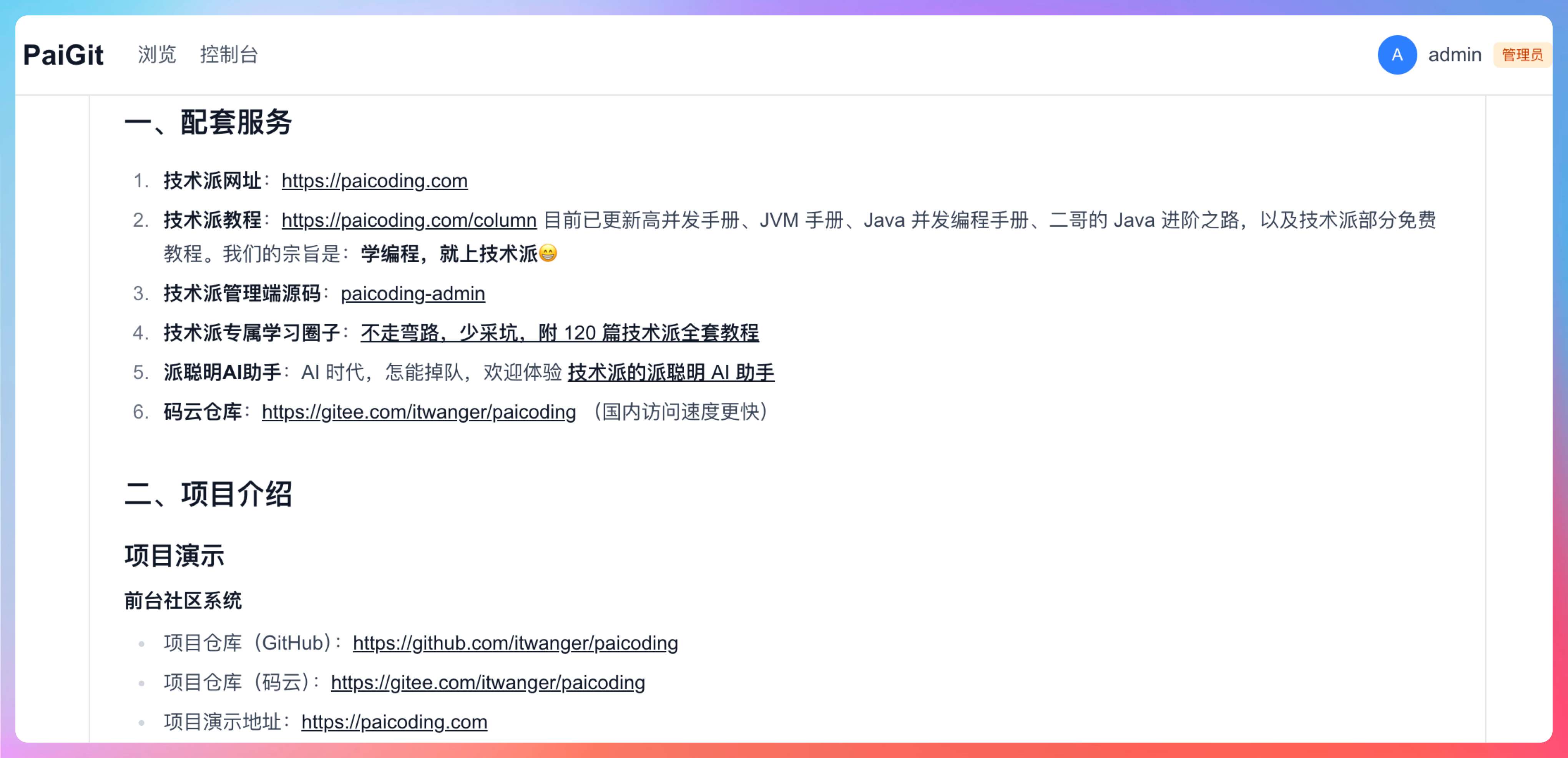 用户说 PaiGit 项目可以导入 GitHub 开源项目了,但 README 展示不够完美,特别是链接没有下划线,鼠标放上去可以点击。 这听起来像是一个前端显示问题。让我先看看 README.md 的内容,了解一下项目是做什么的,然后再看看前端代码中关于链接显示的部分。