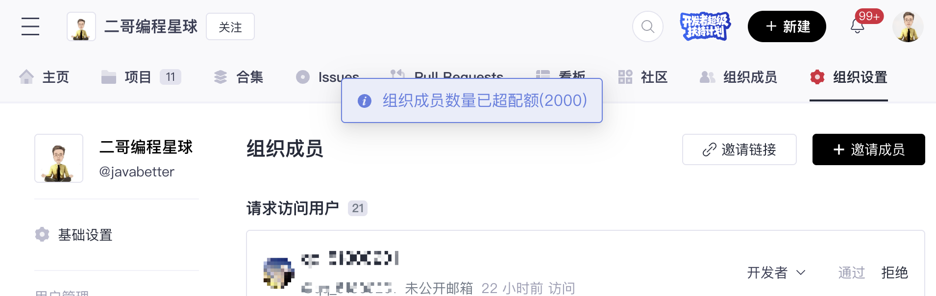 我之前的项目源码是托管在 GitCode 的,但这玩意比较坑的是,组织配额只有 2000 人,并且不支持扩展,导致后续申请的小伙伴都没办法拿到源码权限了。