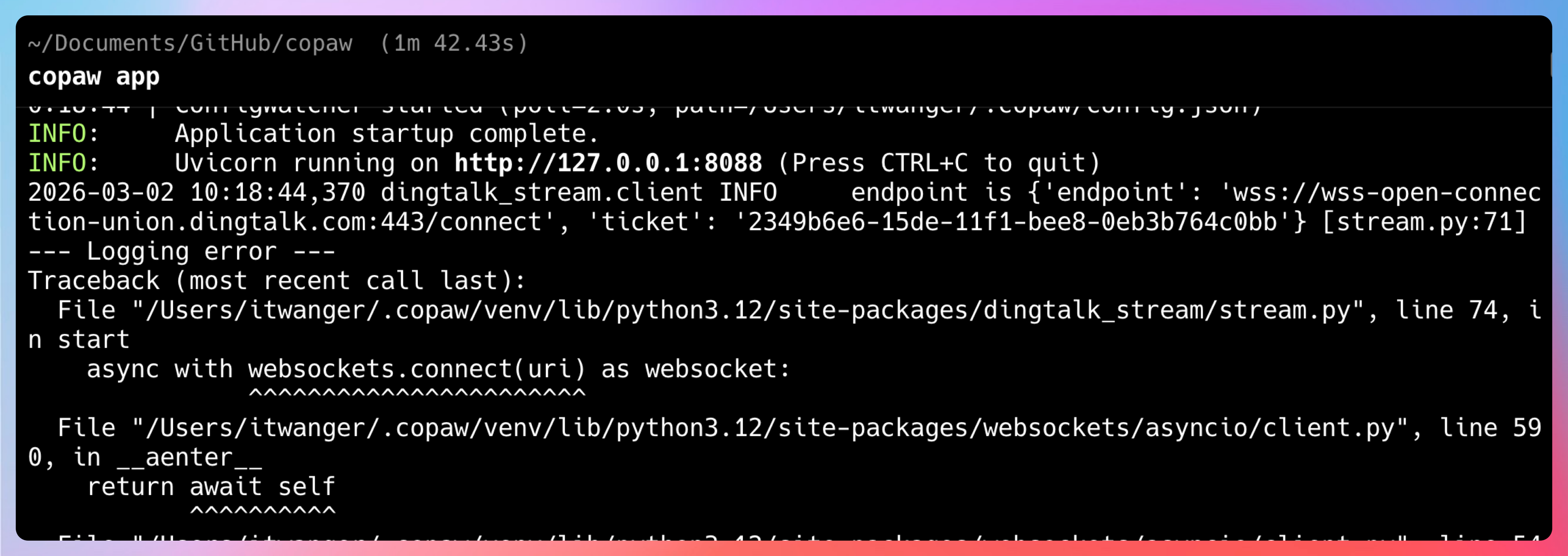 - 基于 CoPaw 框架,配置并部署了本地 Agent 服务,实现钉钉机器人接入,支持自然语言交互和多轮对话记忆功能