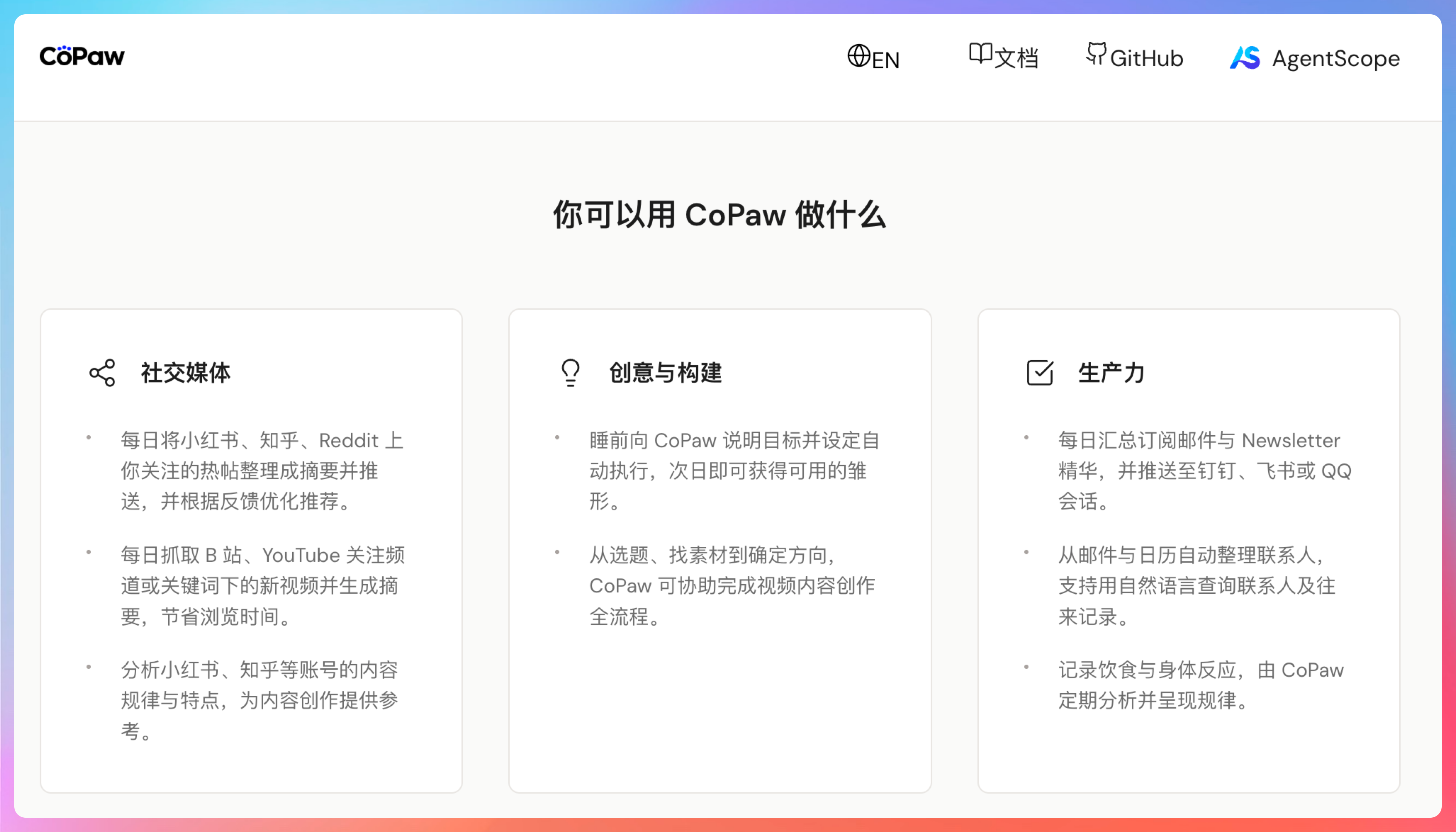 官方对 CoPaw 的介绍是:你的 AI 个人助理;安装极简、本地与云上均可部署;支持多端接入、能力轻松扩展。