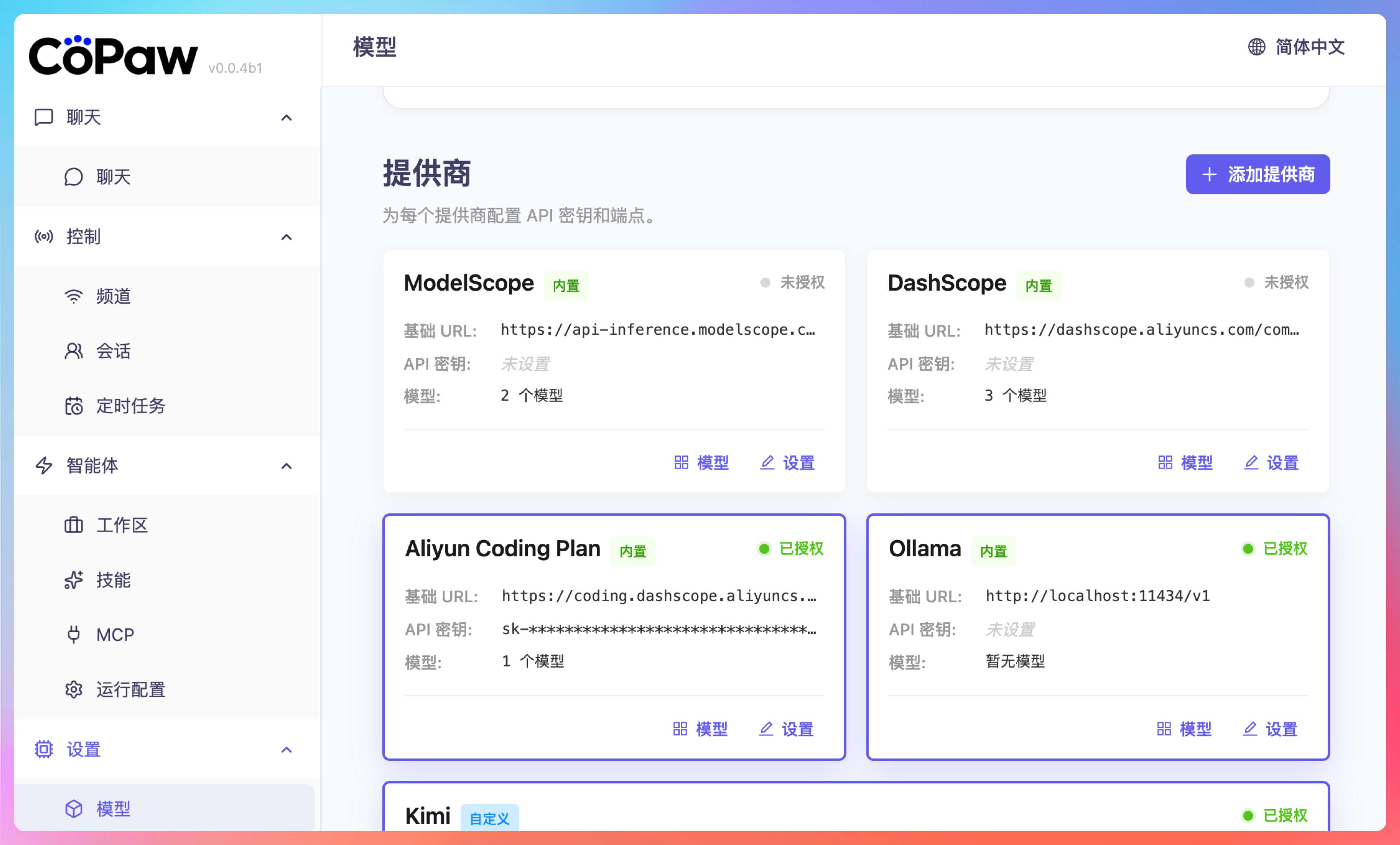CoPaw 原生支持钉钉、飞书、QQ、Discord、iMessage 等平台。