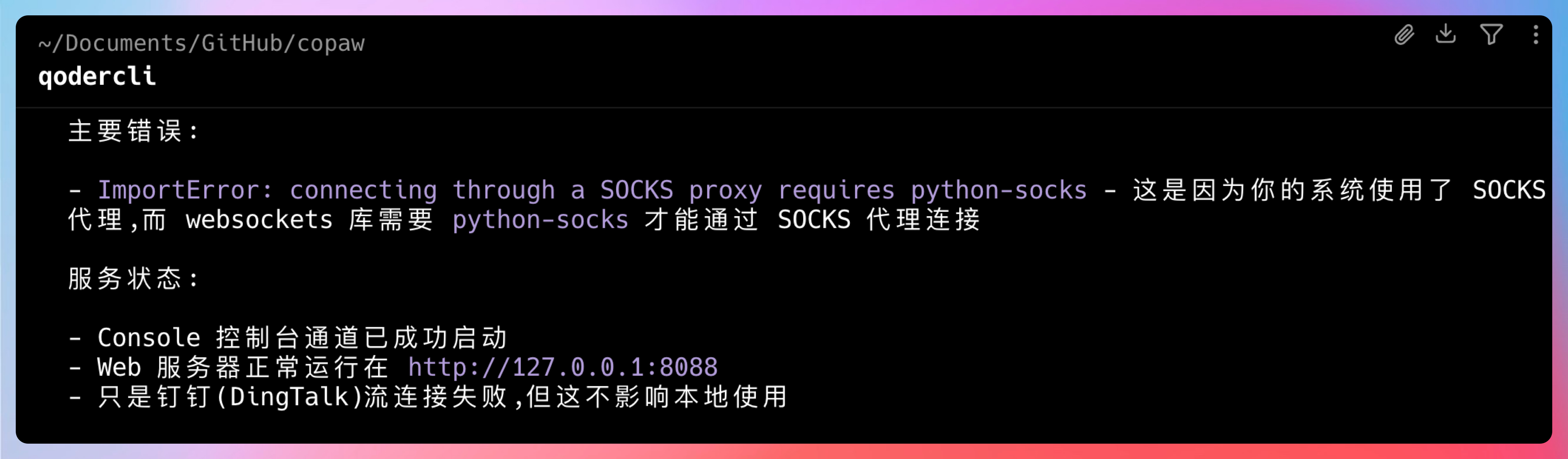 很遗憾,我这里报错了。直接启用 qodercli,然后让它来启动并解决问题试试看。
