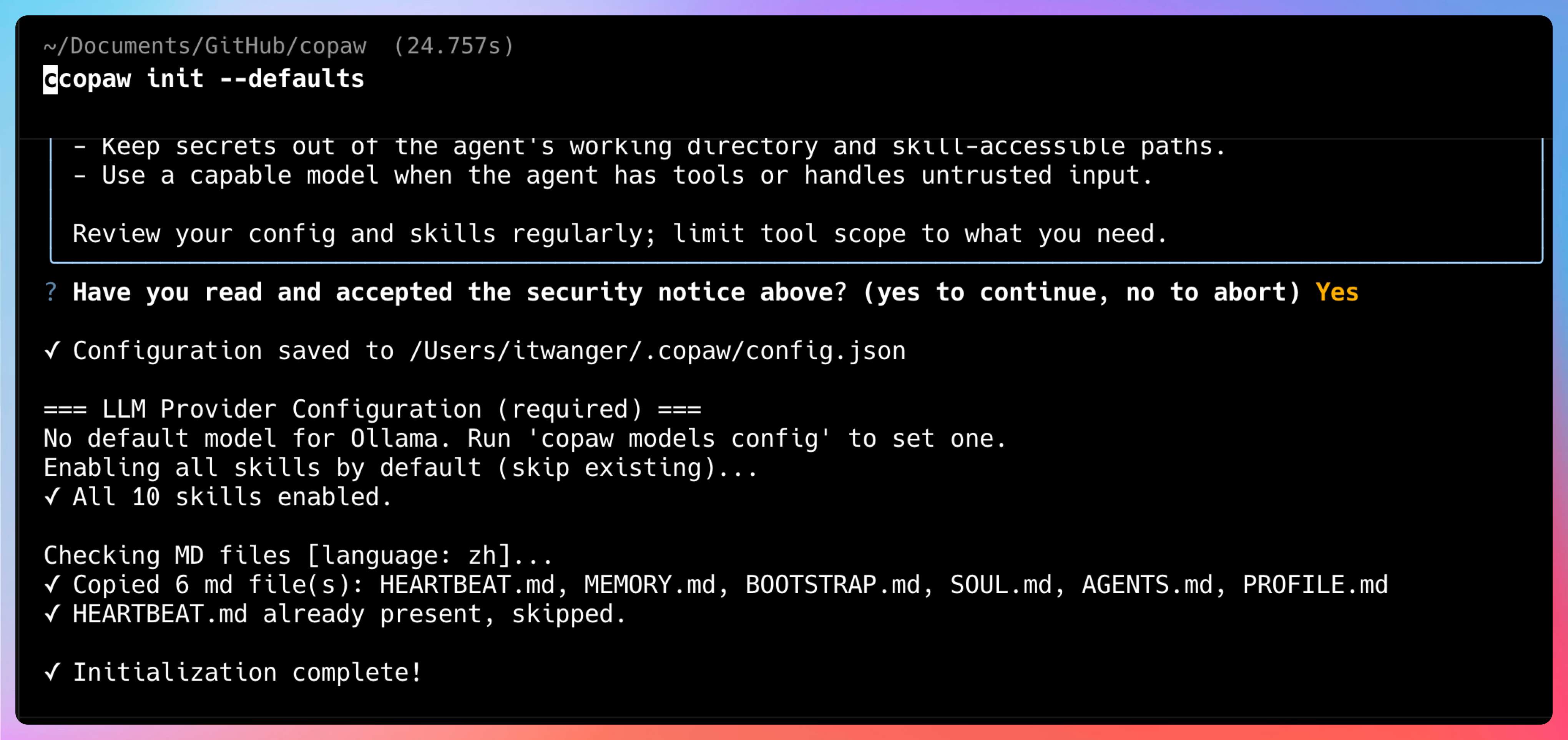 完成安装后,可以通过 copaw init --defaults 初始化。