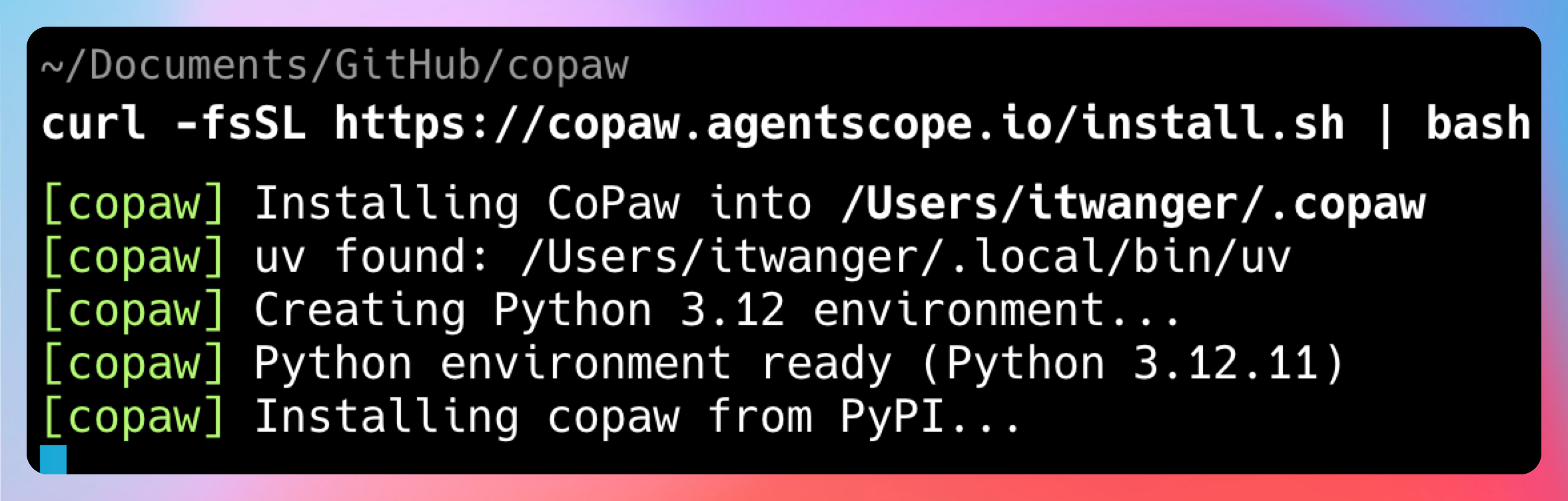CoPaw 提供了一键安装脚本,非常简单: