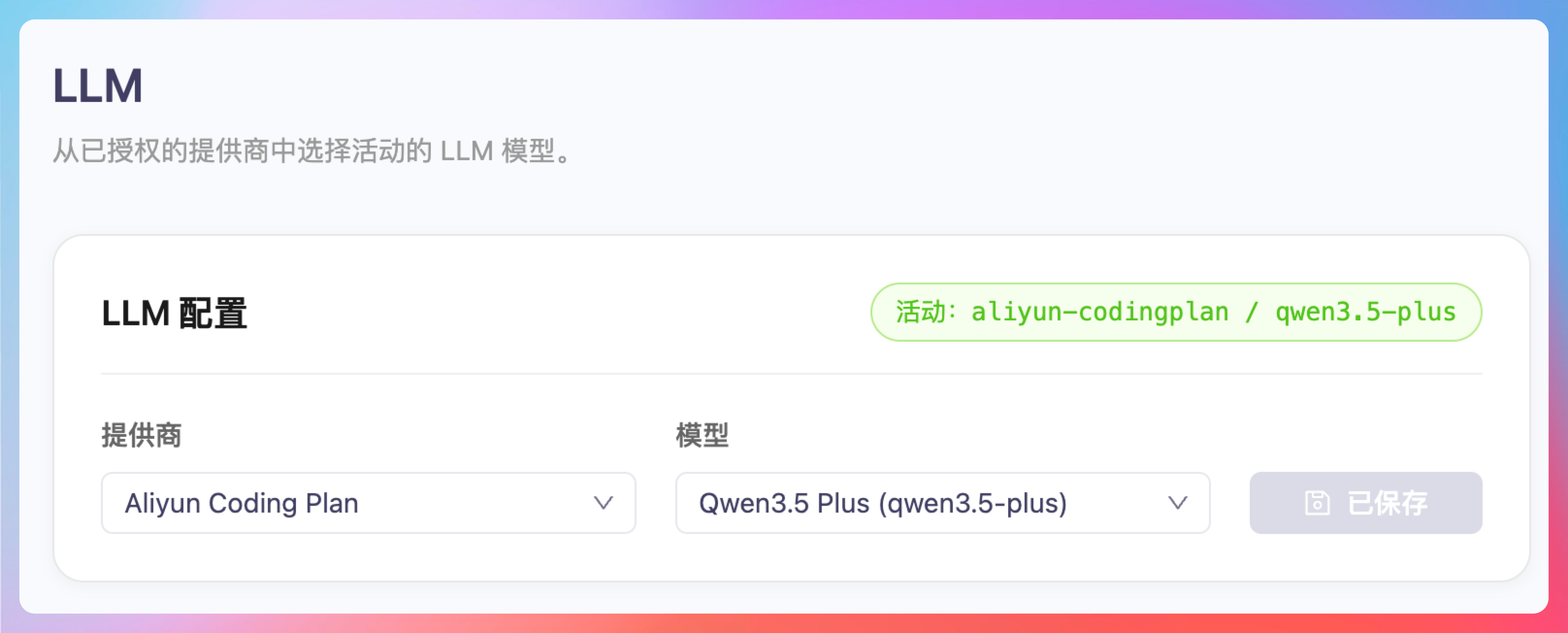 如果你订阅了通义千问的 Coding Plan,LLM 配置这里提供商默认为 coding plan,模型为 Qwen3.5-Plus,点击保存。