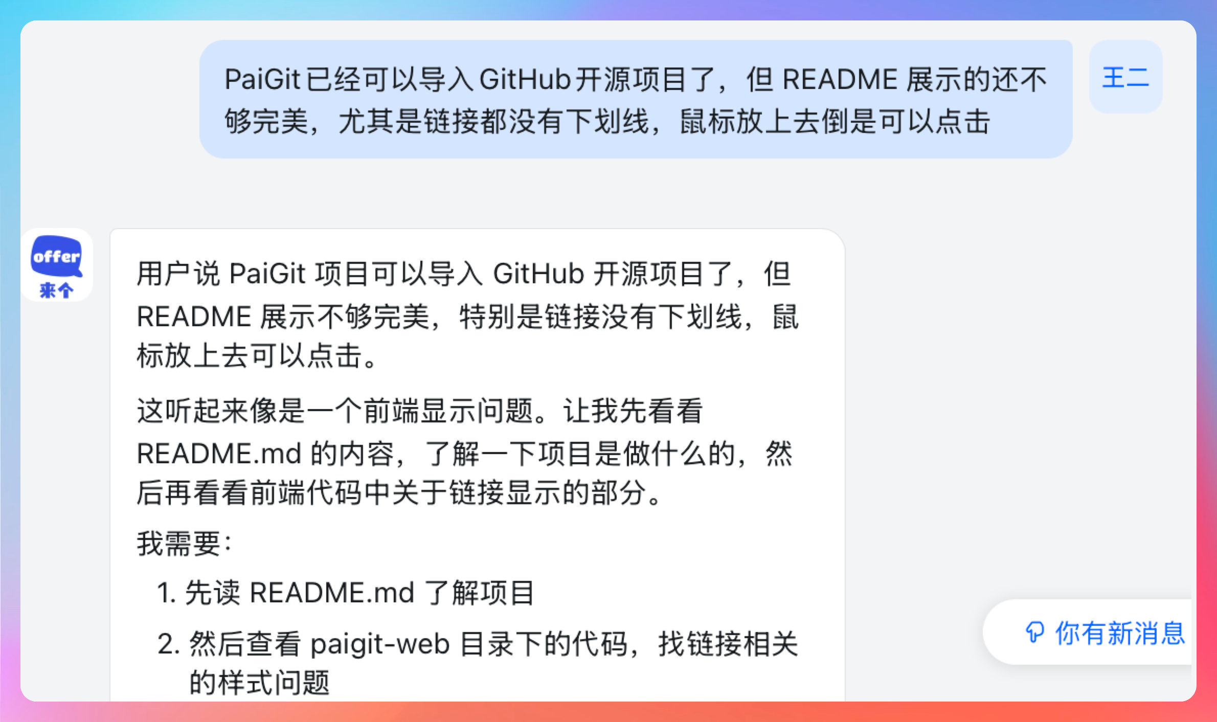 好,上我们的需求:PaiGit 已经可以导入 GitHub 开源项目了,但 README 展示的还不够完美,尤其是链接都没有下划线,鼠标放上去倒是可以点击。