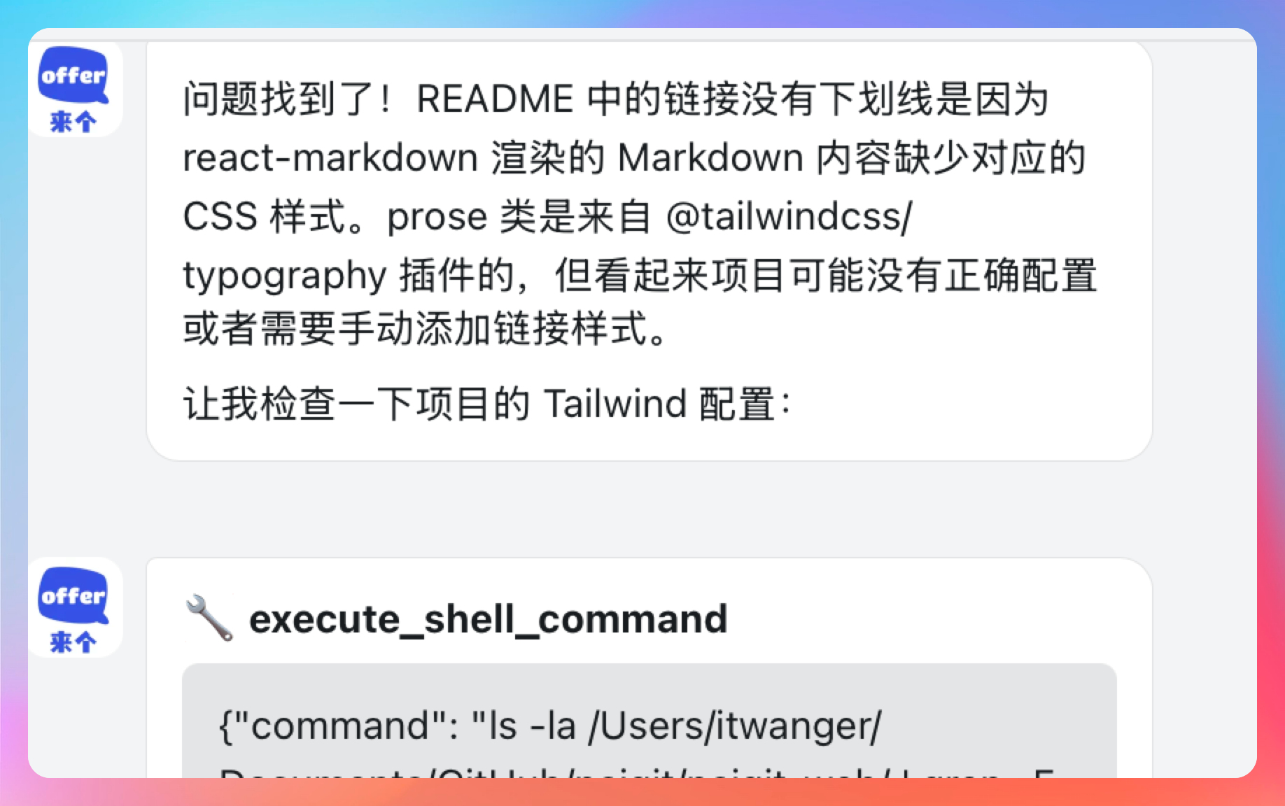 接着回复:问题找到了!README 中的链接没有下划线是因为 react-markdown 渲染的 Markdown 内容缺少对应的 CSS 样式。prose 类是来自 @tailwindcss/typography 插件的,但看起来项目可能没有正确配置或者需要手动添加链接样式。