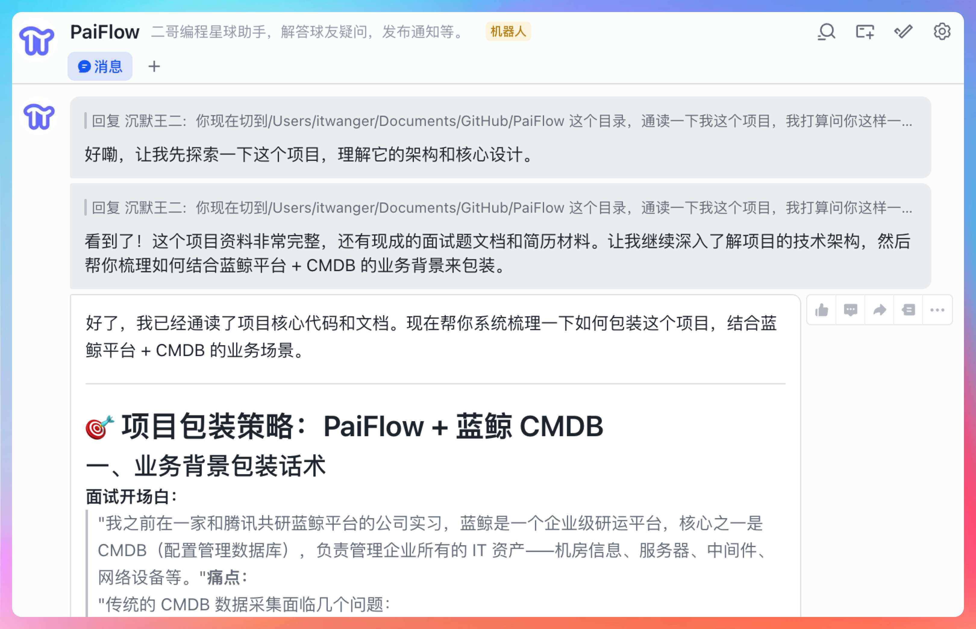 再比如说,我们可以把 CoPaw 的学习变成我们的求职经验,把 CoPaw 作为我们 Agent 工具去优化迭代 PaiGit。