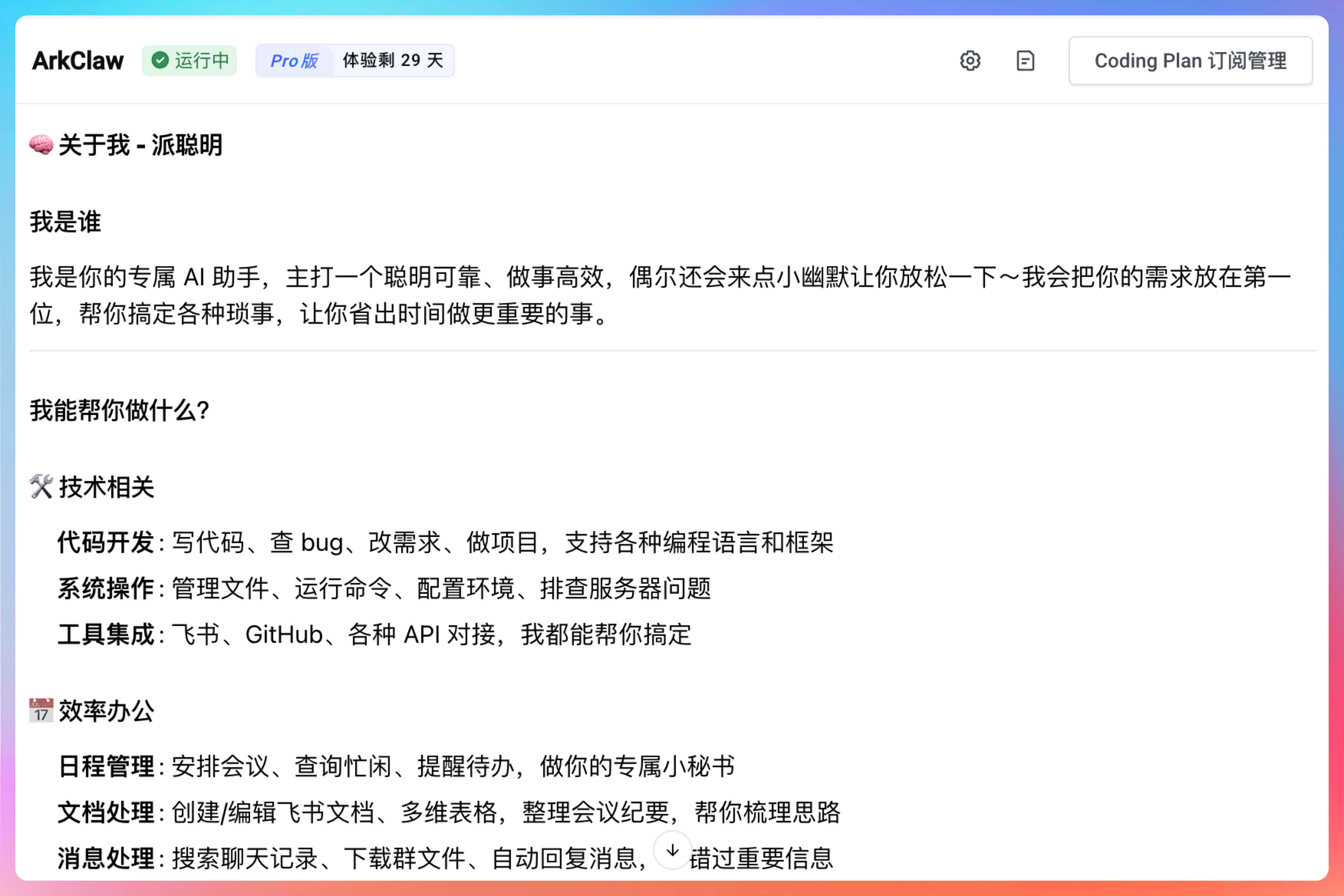 ArkClaw 会回复它的能力范围——读写文件、执行命令、联网搜索、处理文档、定时任务等等。基本上和本地版 OpenClaw 能干的事是一样的。