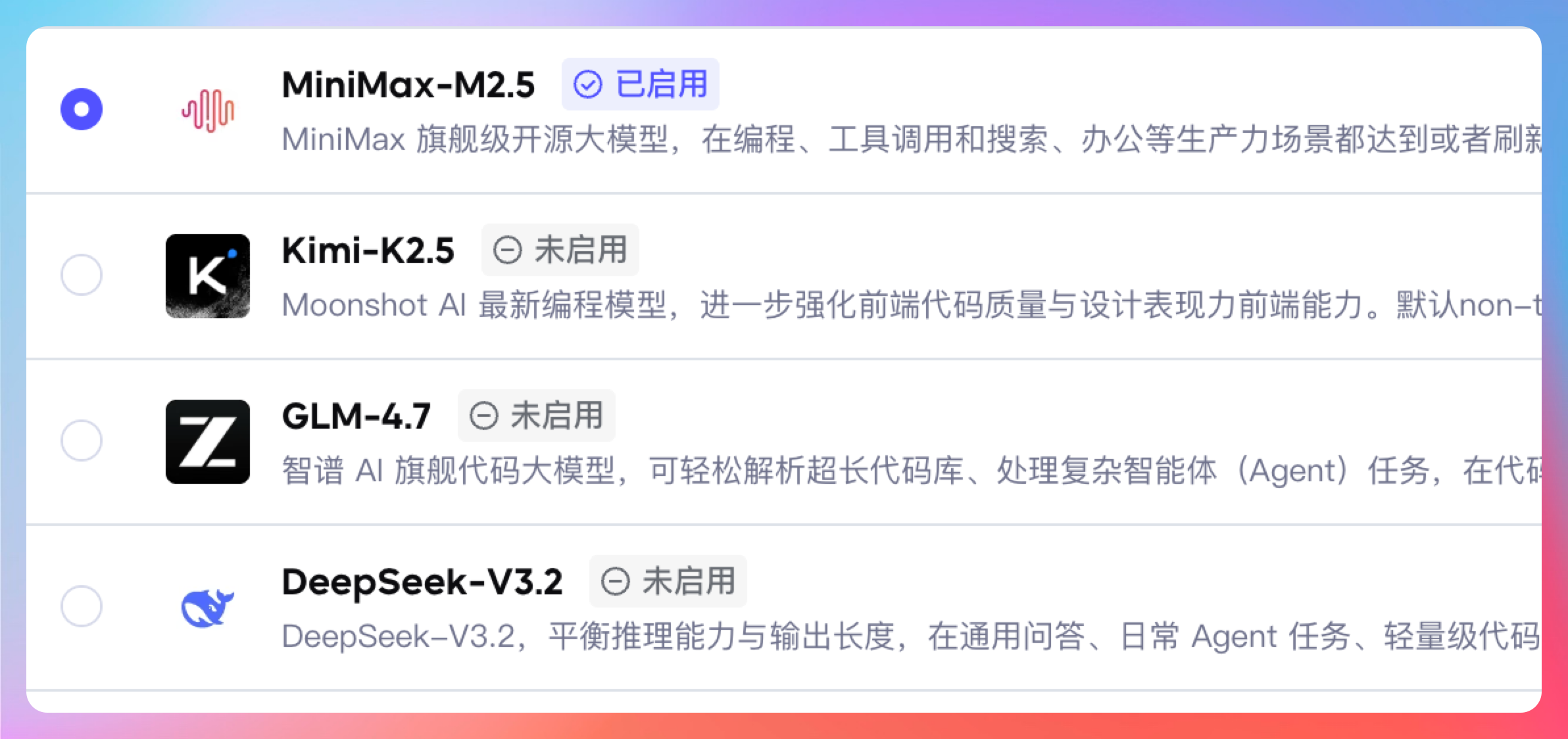 MiniMax 的 M2.5 也正式加入了 Coding Plan 的模型列表。MiniMax 在长文本和创意写作方面一直有口碑,M2.5 在多轮对话上的表现也不错。如果你的 ArkClaw 使用场景偏向内容生成、文案撰写,M2.5 是一个值得试试的选项。