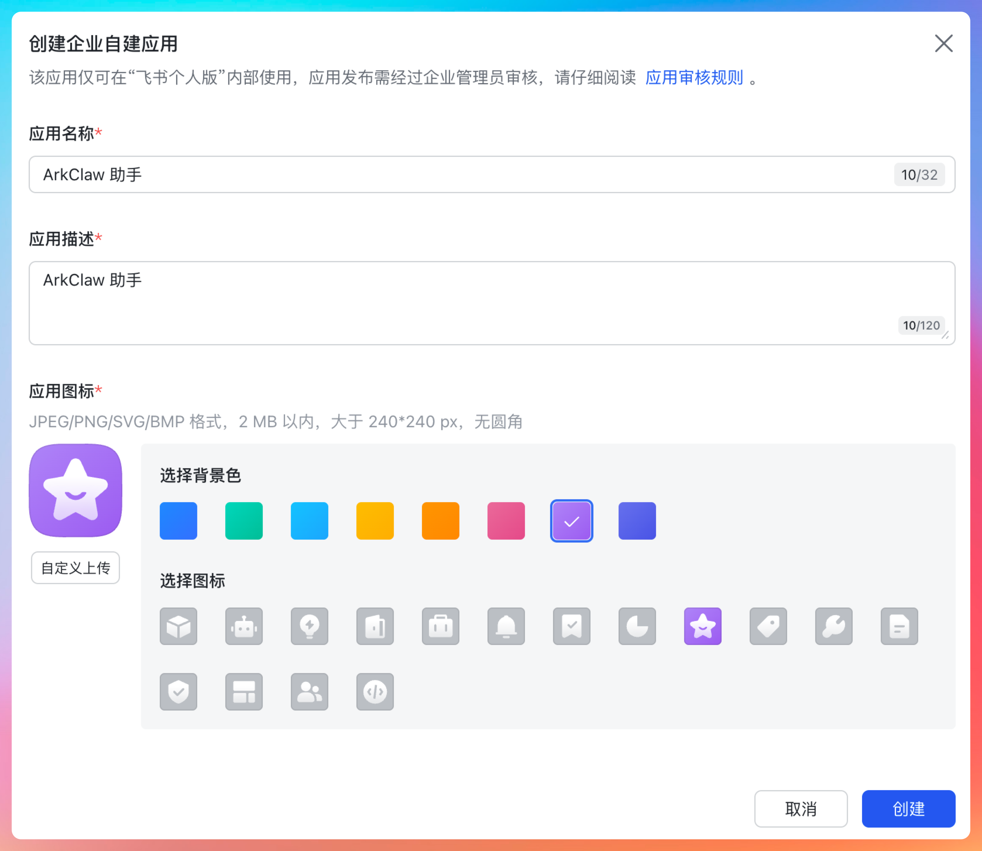 创建一个企业自建应用,名字随便取,比如 ArkClaw 助手。