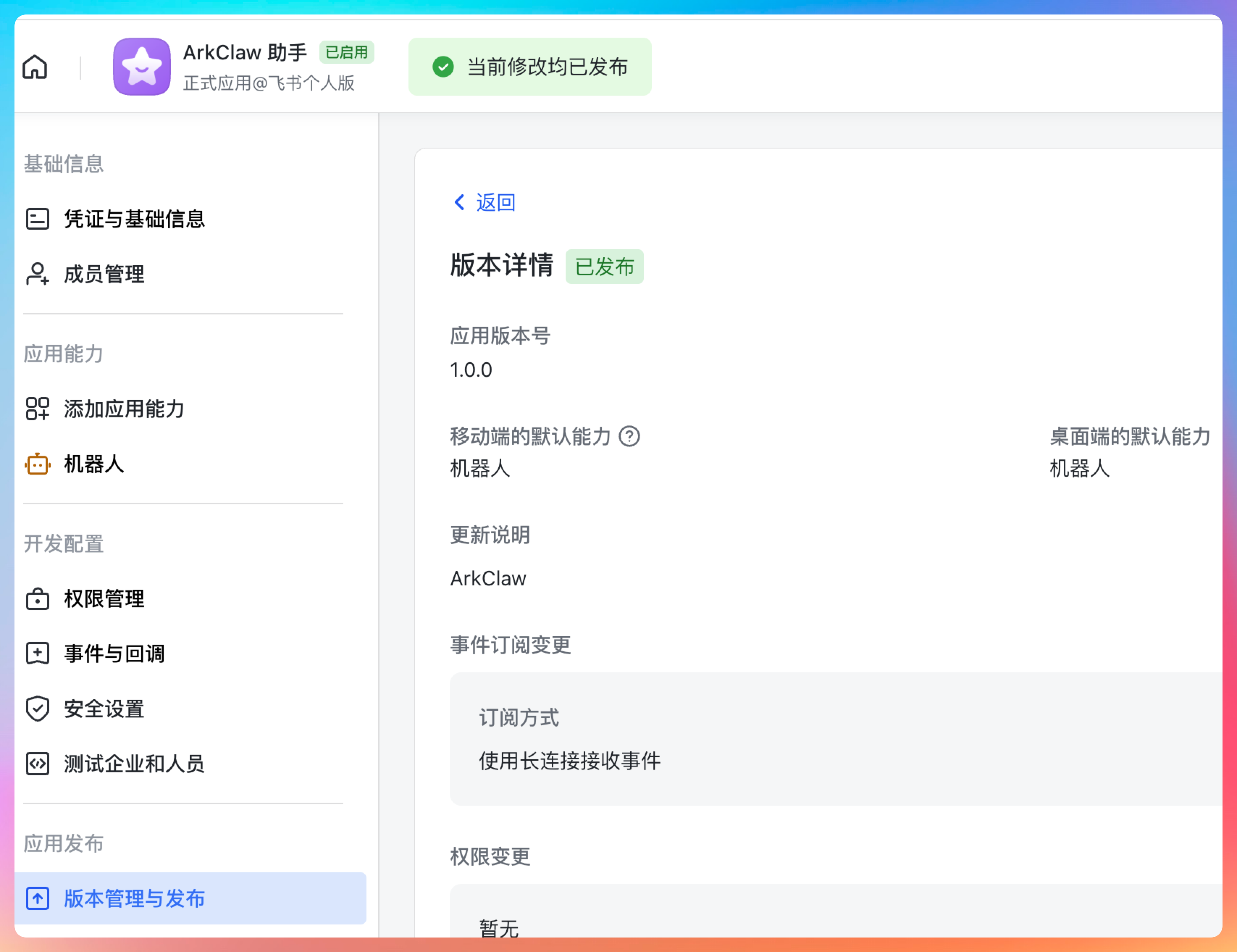 在飞书开放平台的版本管理页面,创建版本并发布(飞书的审核基本是秒过的)。