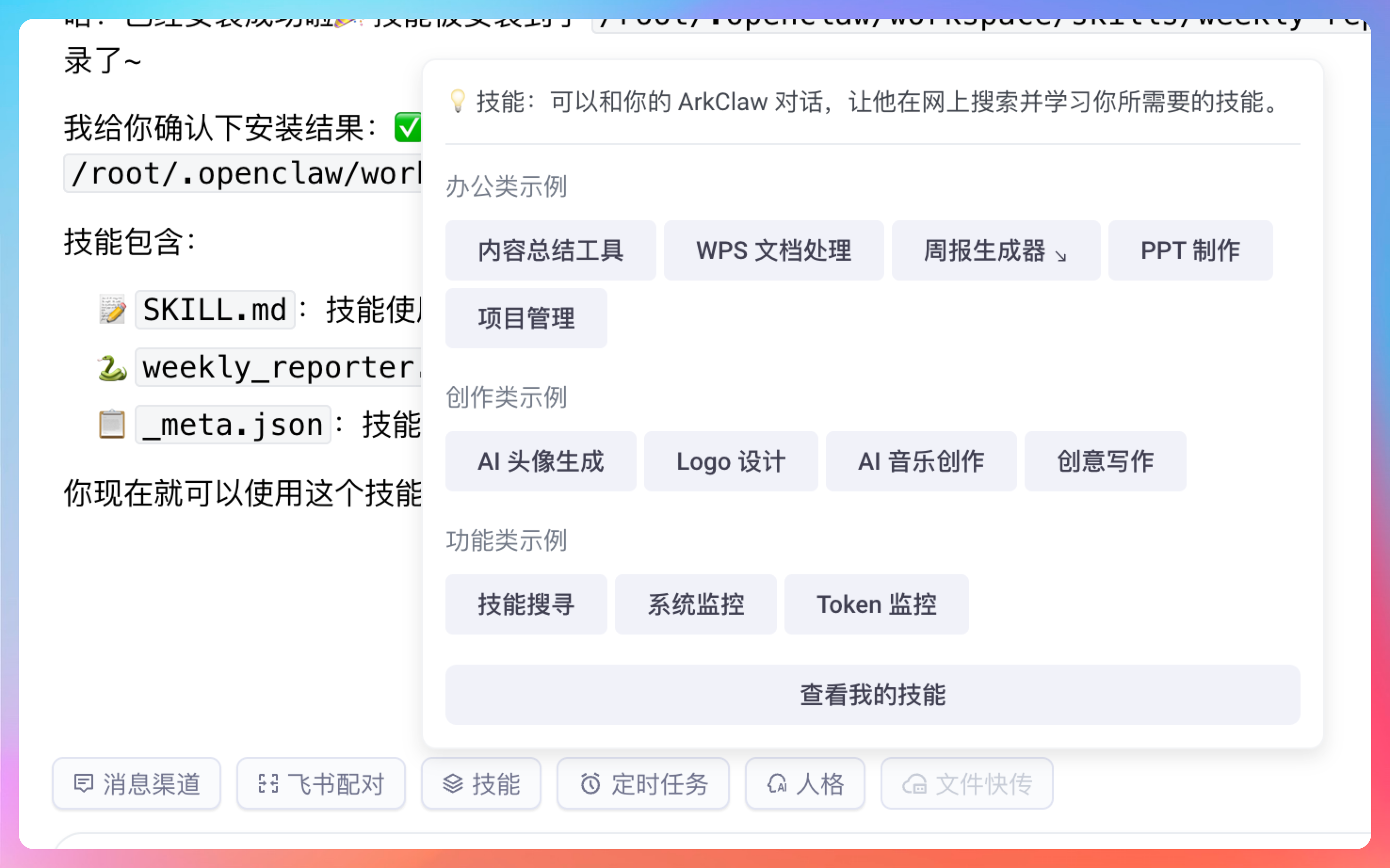 点开 ArkClaw 的技能 button,点击【周报生成器】,然后安装这个技能。