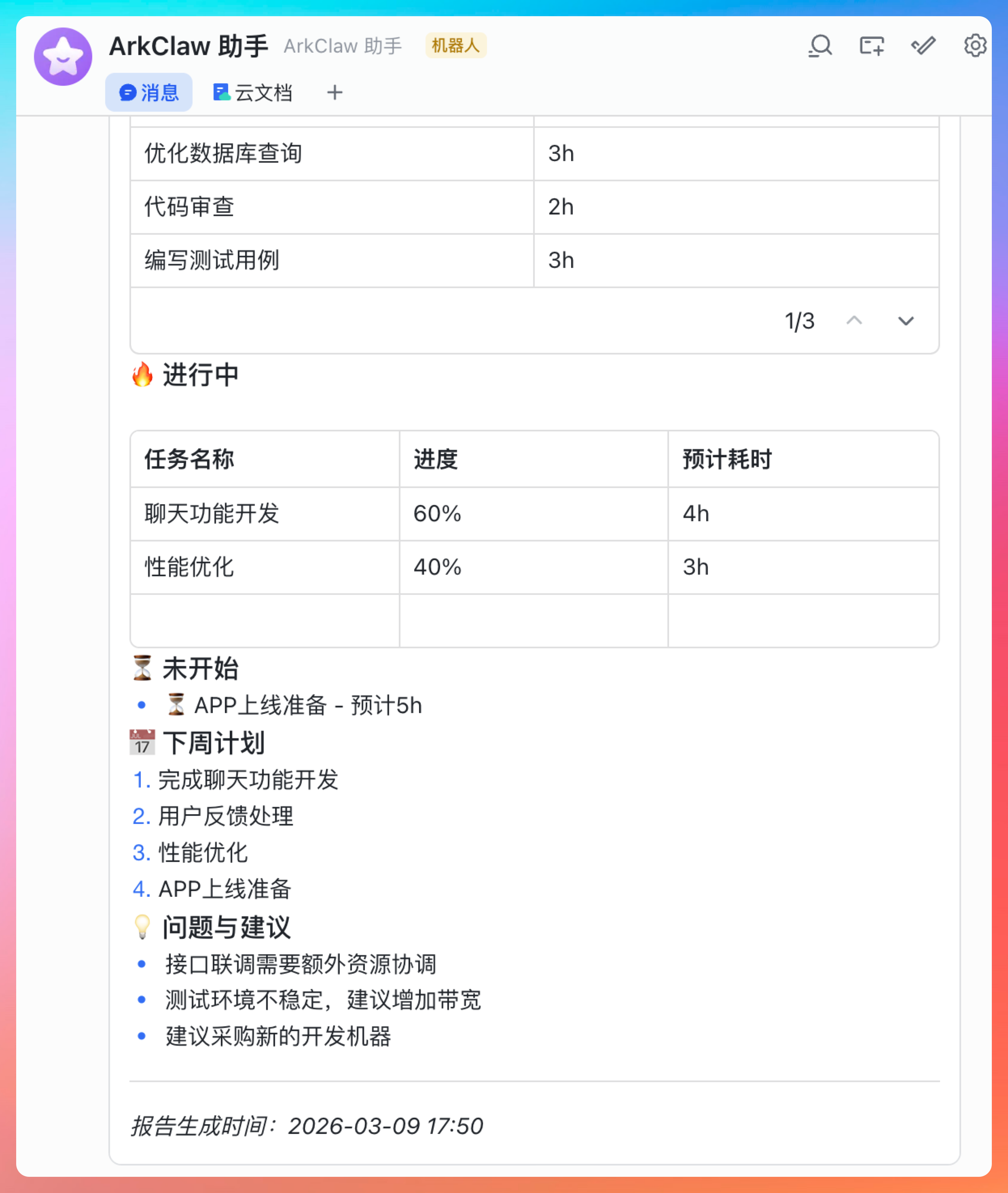 然后让 ArkClaw 帮我们生成一份周报。