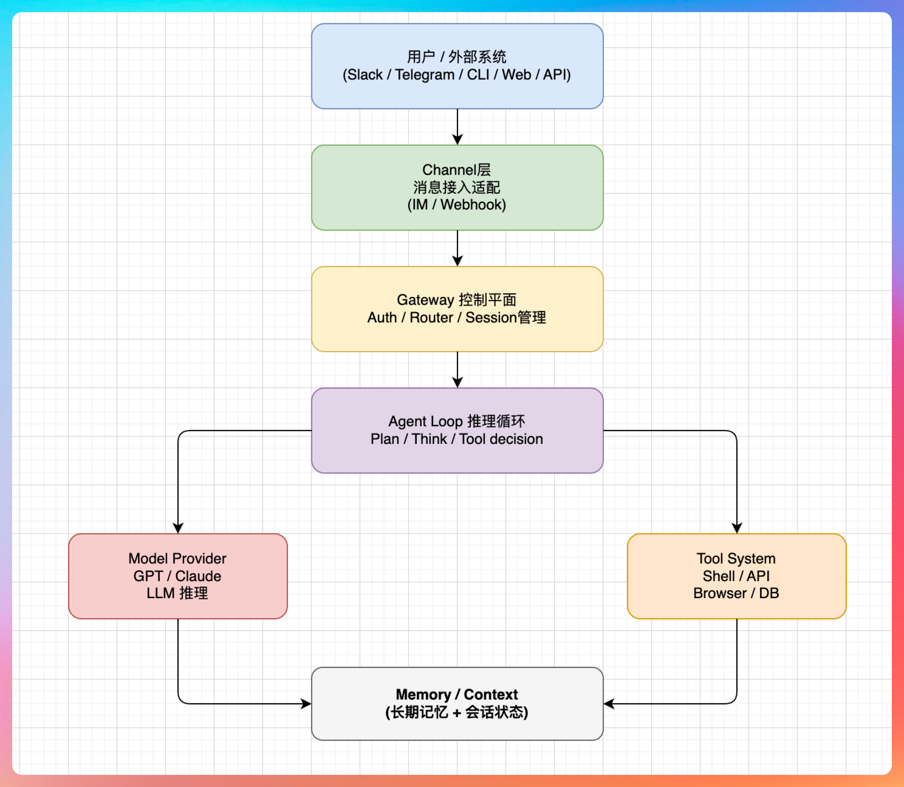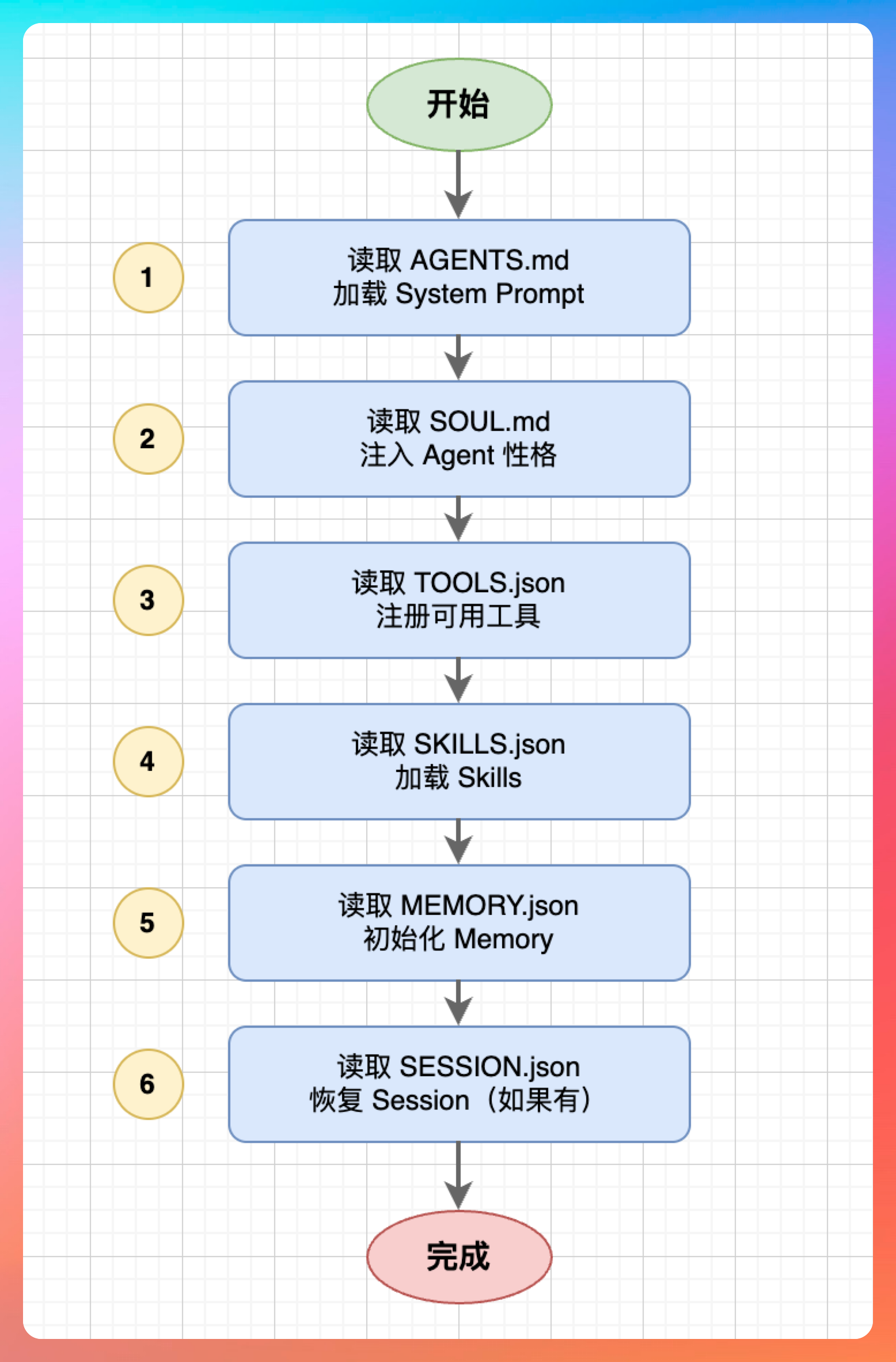 - 加载阶段:读取 AGENTS.md、SOUL.md 等配置文件,初始化 Agent 的人格和能力