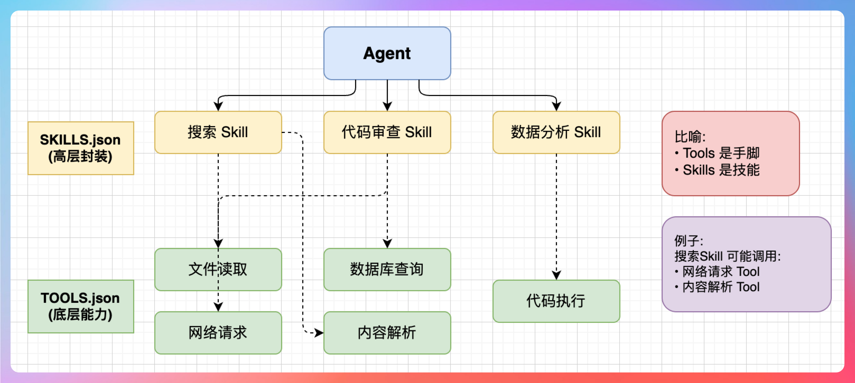 “比如‘搜索’这个 Skill,可能调用了‘网络请求’Tool 和‘内容解析’Tool。”