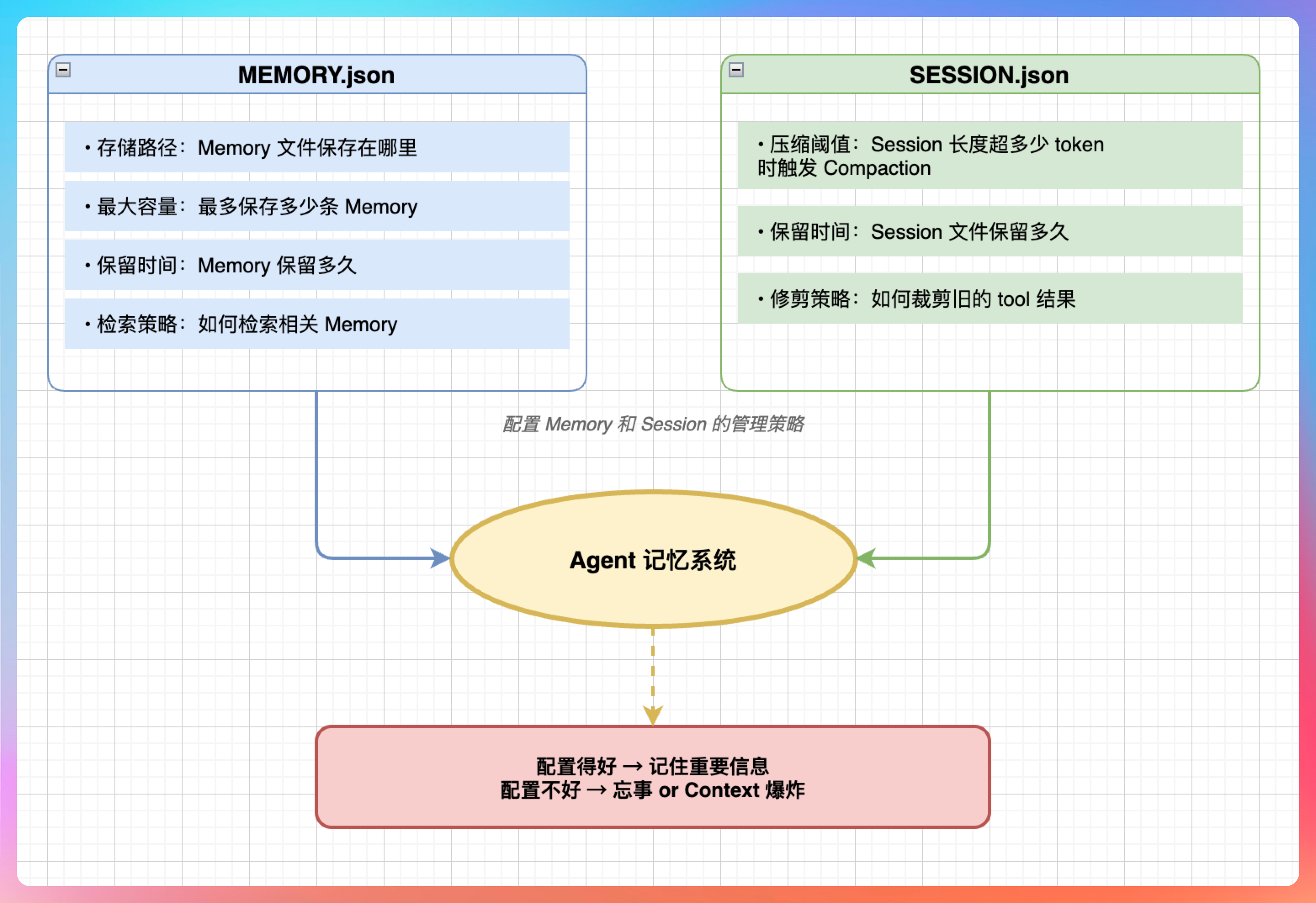 “这两个配置直接影响 Agent 的‘记忆力’。配置得好,Agent 能记住重要信息;配置得不好,Agent 要么忘事,要么 Context 爆炸。”