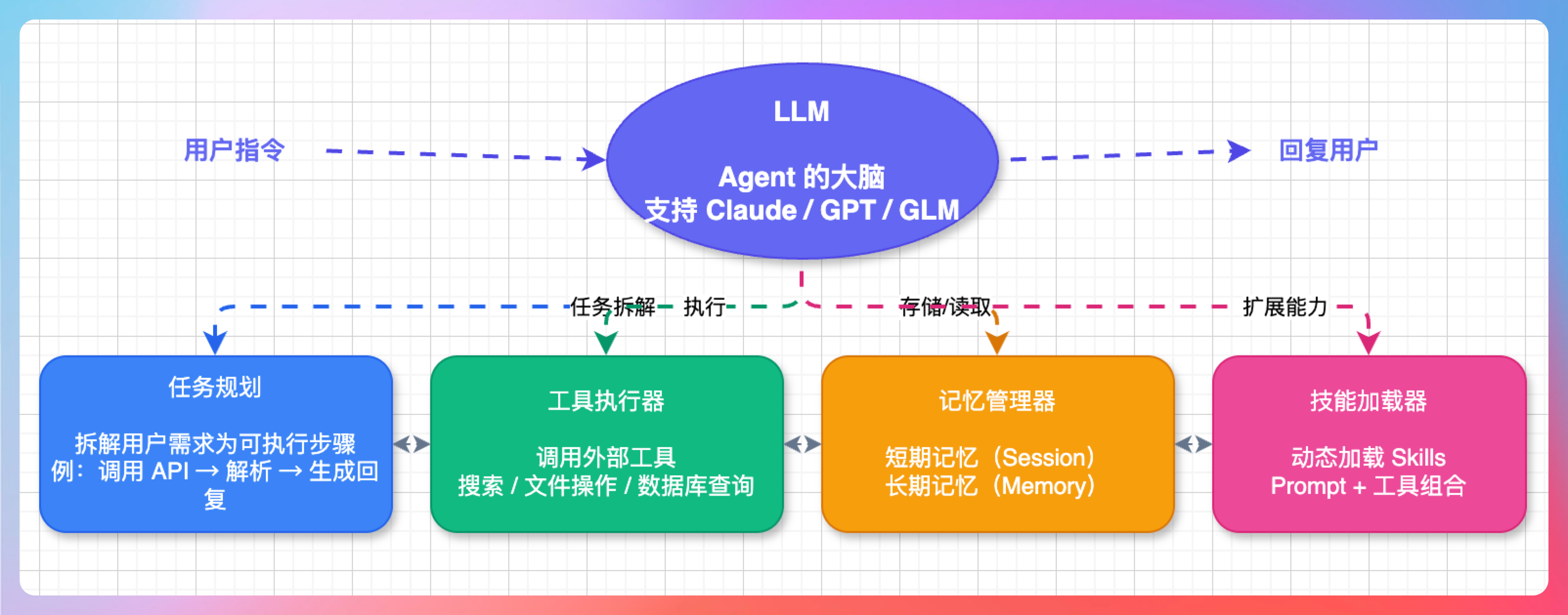 任务规划:把用户的自然语言需求,拆解成可执行的任务步骤。比如“帮我查天气”,会拆解成:调用天气 API → 解析返回数据 → 生成回复。