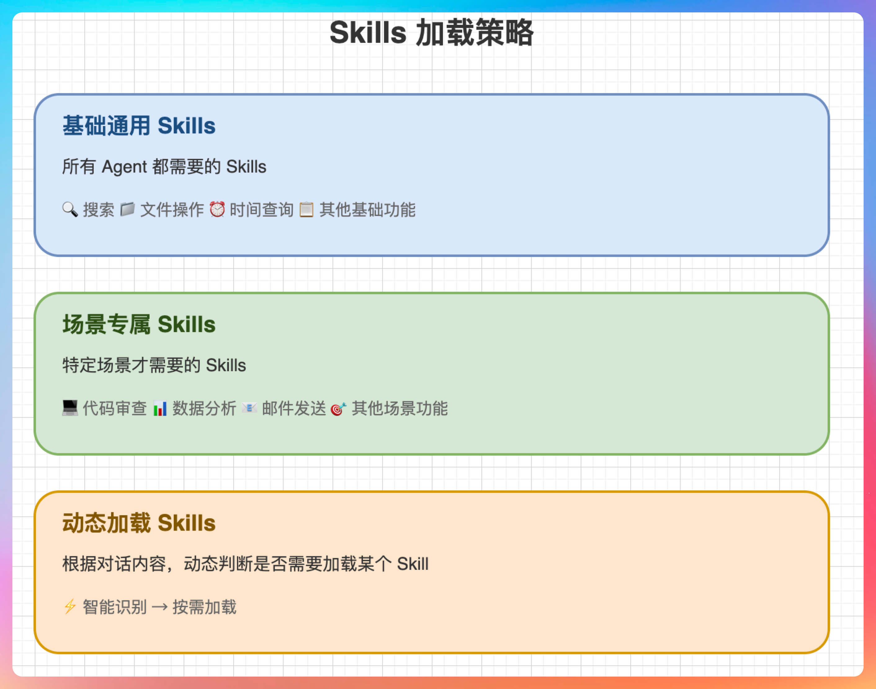 精简原则:只加载必要的 Skills,不要贪多。一般来说,一个 Agent 加载 5-10 个 Skills 就够了。
