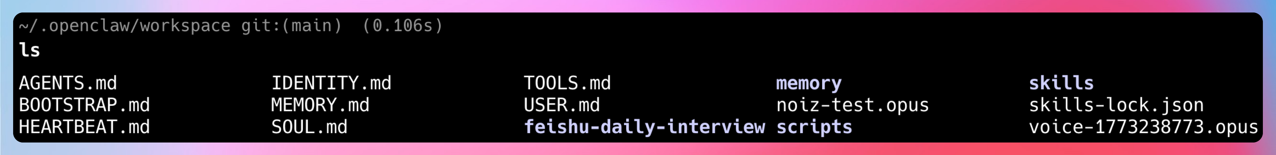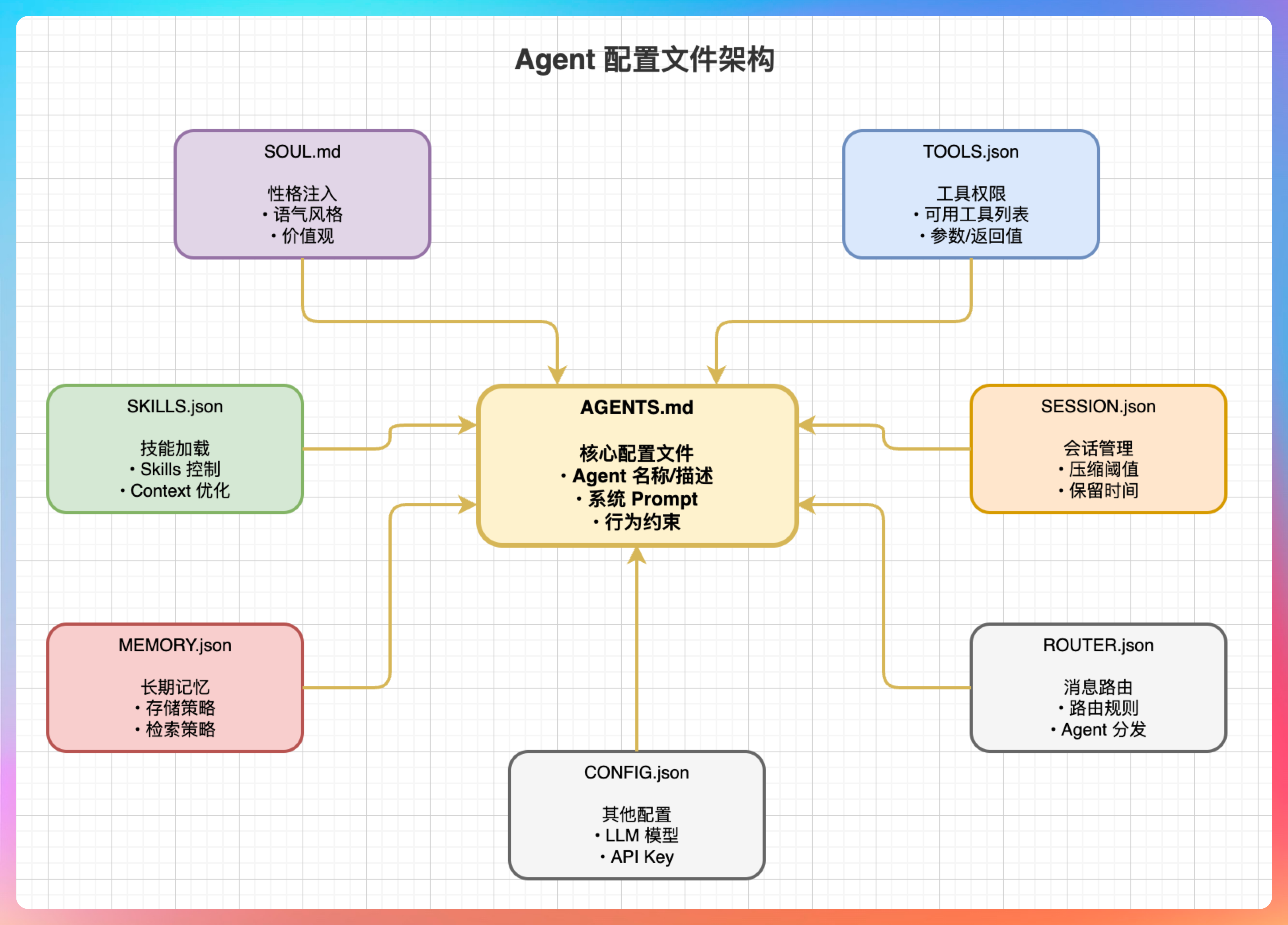 我说:“AGENTS 定义能力边界,SOUL 注入灵魂,TOOLS 划定禁区,这 8 个文件构成 Agent 的完整人格。”