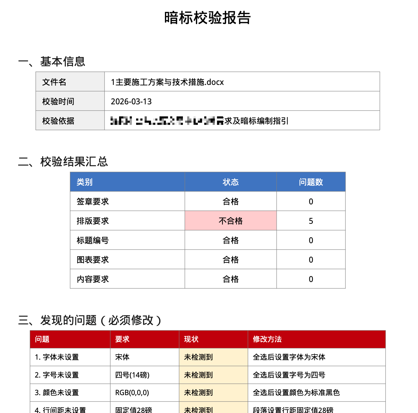 其中签章要求合格、排版要求不合格、标题编号合格、图表要求合格、内容要求合格。