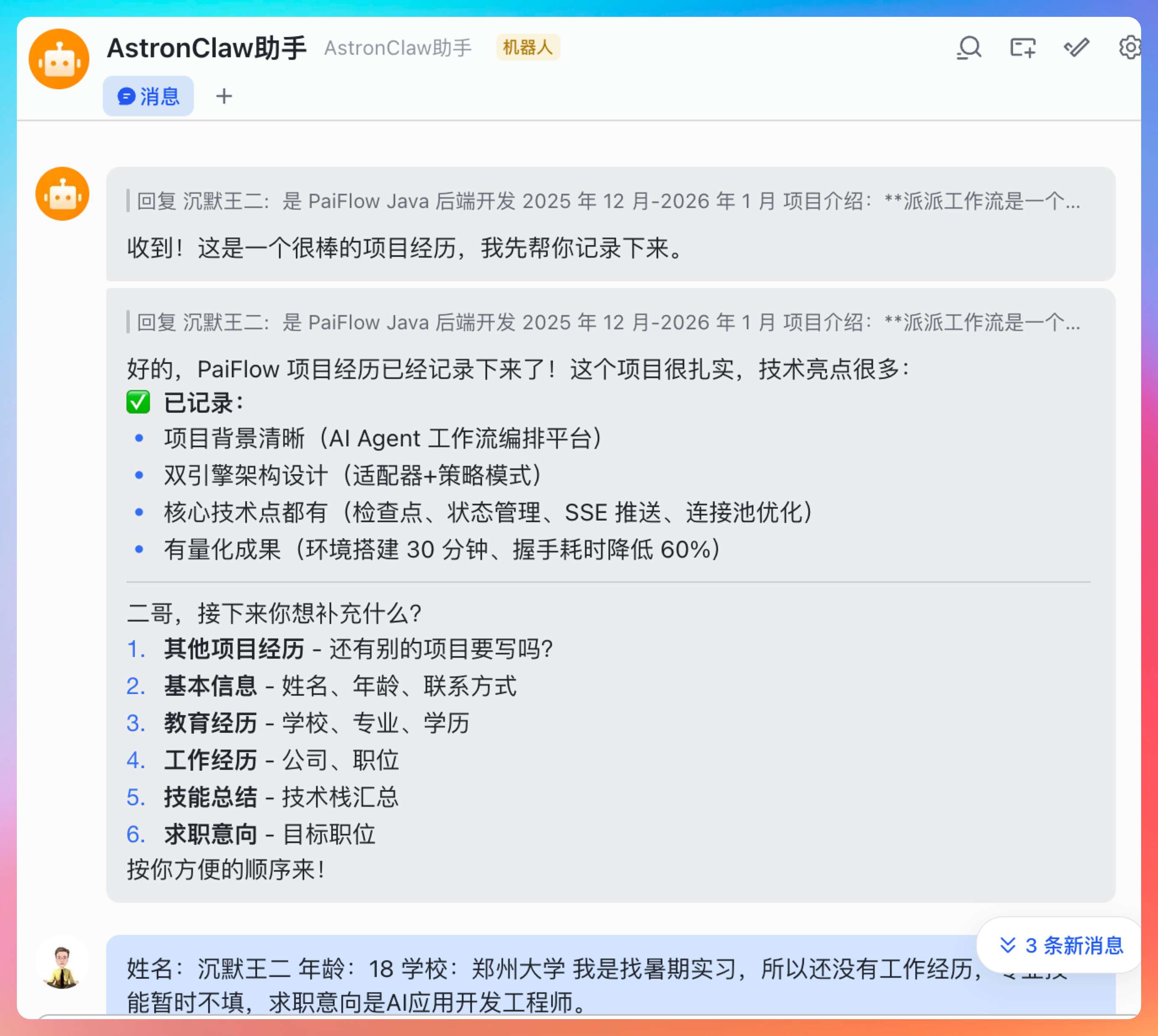 然后 AstronClaw 就开始收集我们的信息并告诉我们还需要填哪些信息。