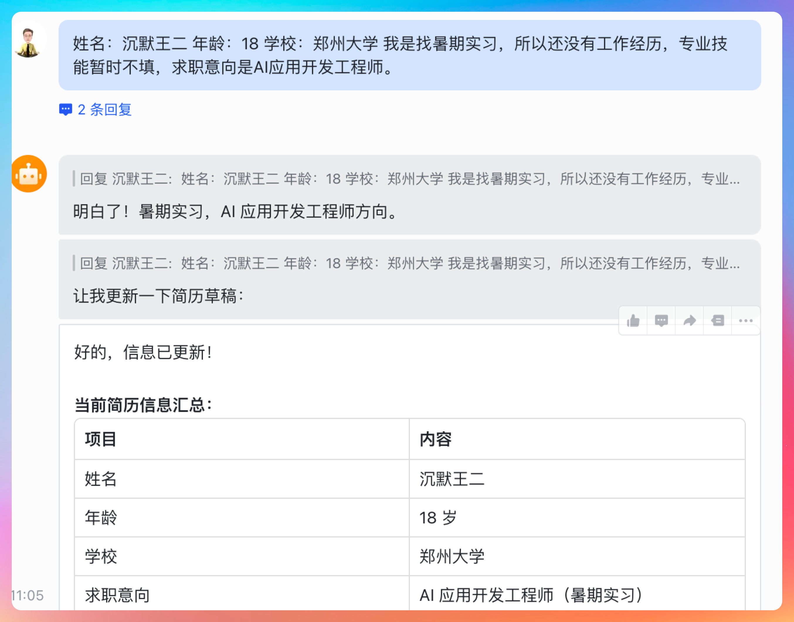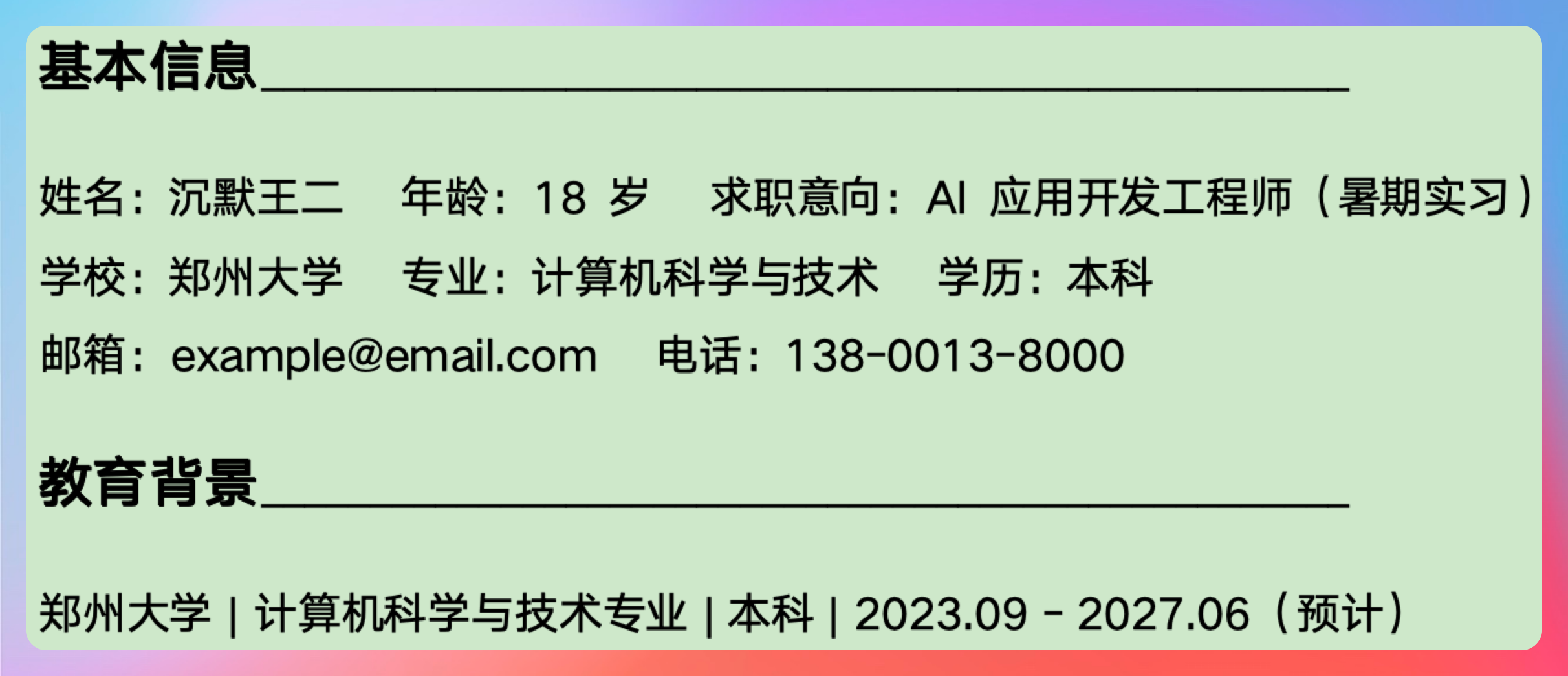 提示词:姓名:沉默王二 年龄:18 学校:郑州大学 我是找暑期实习,所以还没有工作经历,专业技能暂时不填,求职意向是 AI 应用开发工程师。