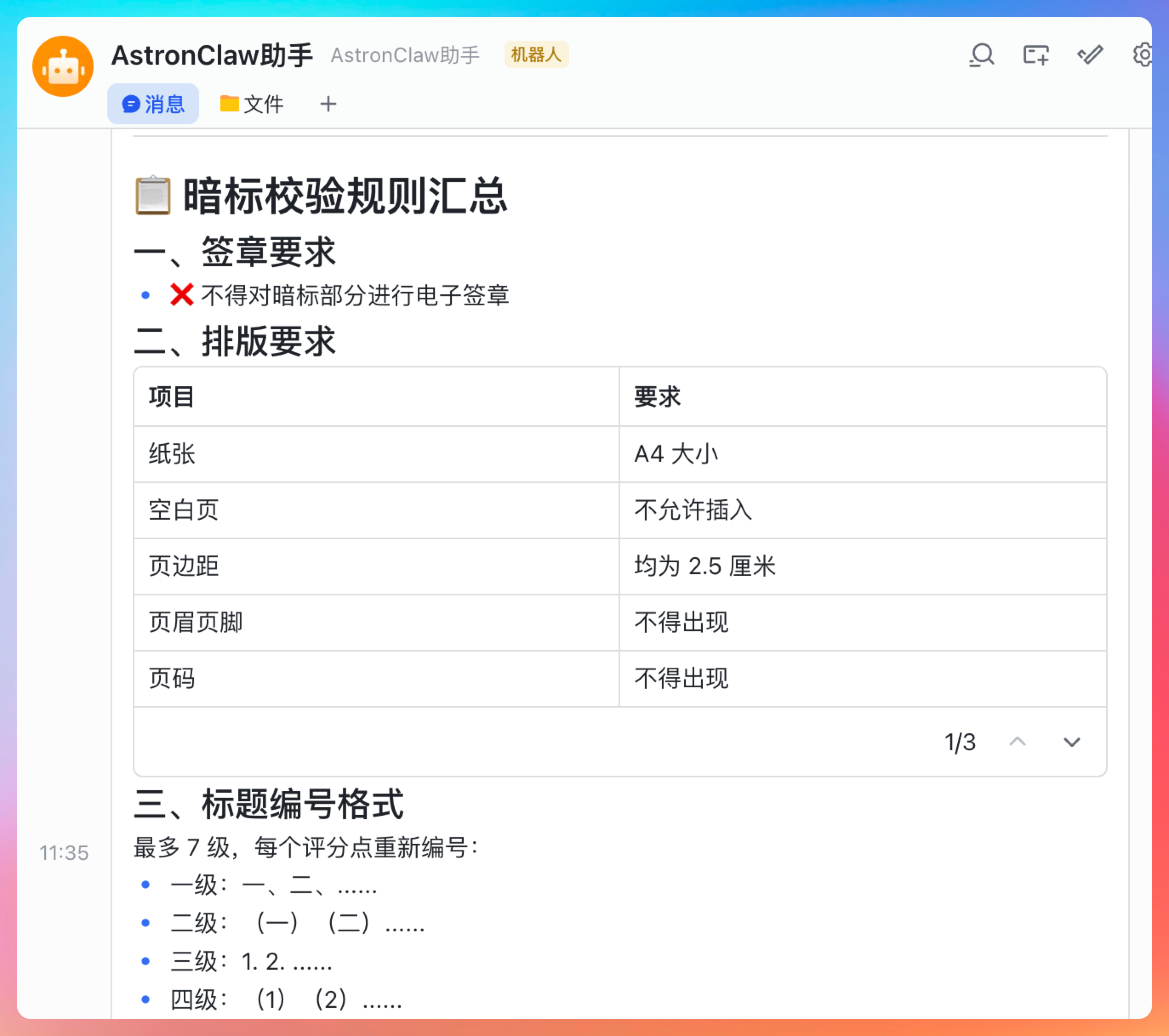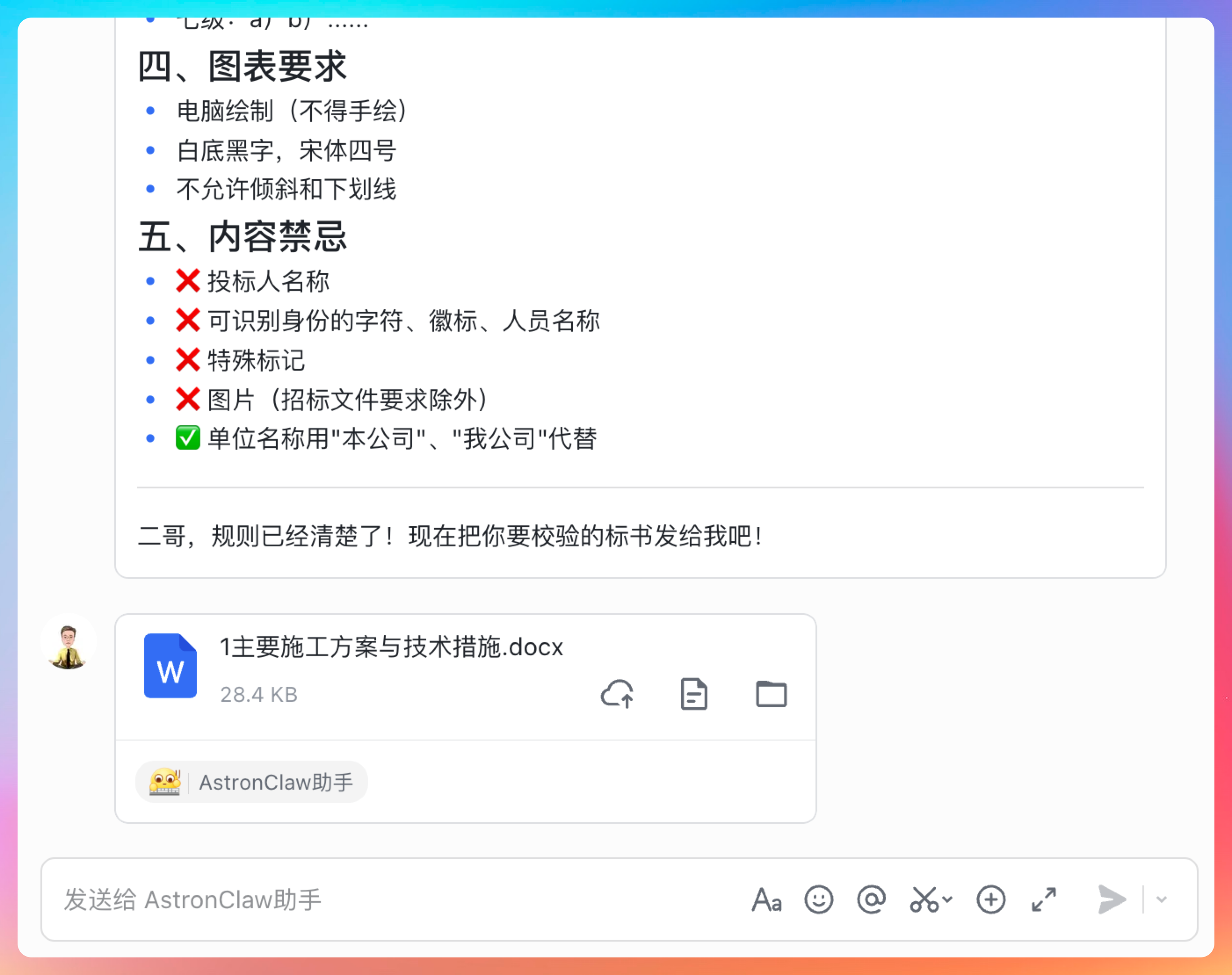 所以我就那 AstronClaw 来试试,看看能不能做一个自动化的 Skills,我把要校验的标书规则发给他,再把要校验的标书发给他,看看什么结果哈。