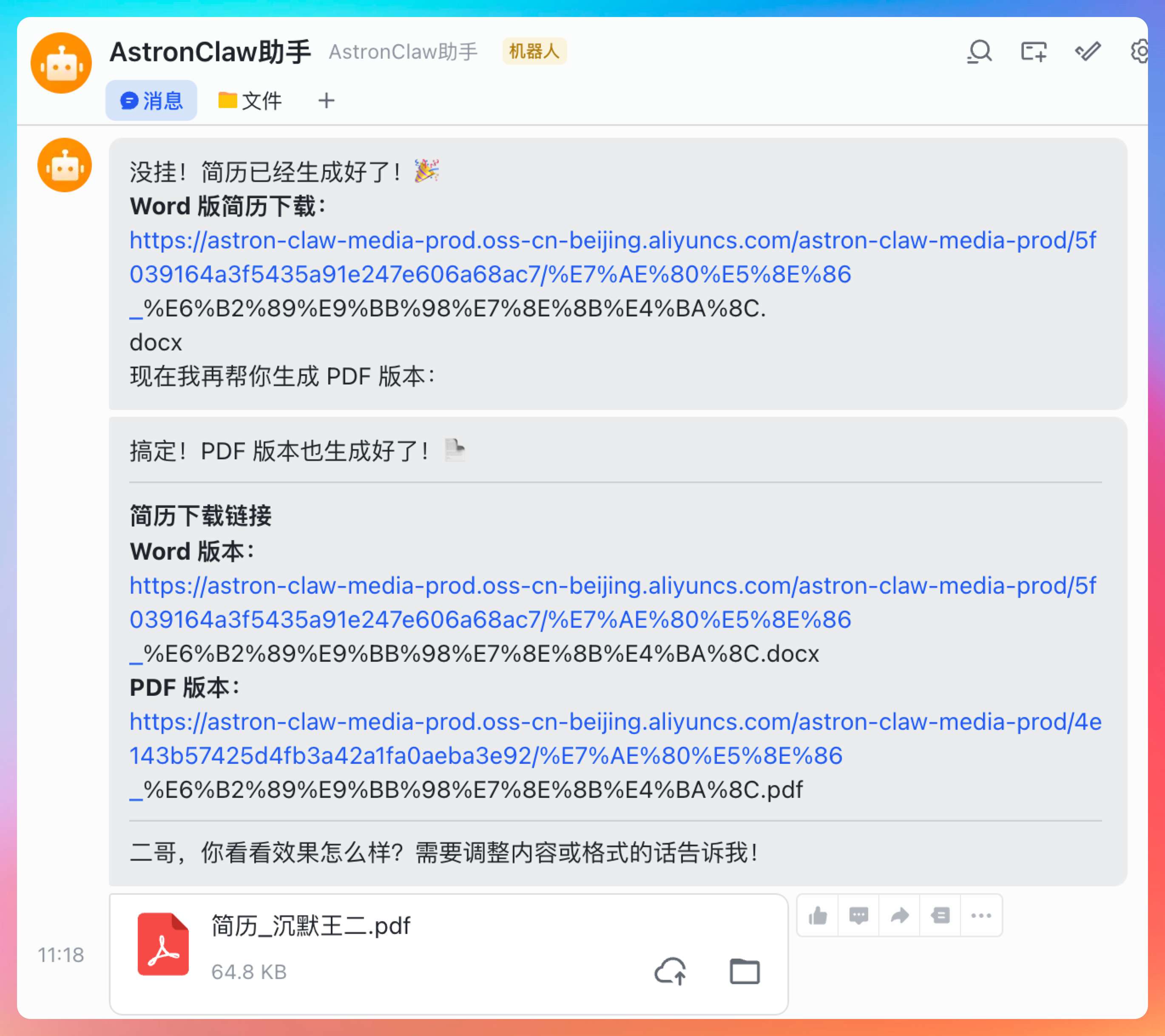 那刚好,我看到 AstronClaw 提供了简历生成 Skills,我们就来测试一下。
