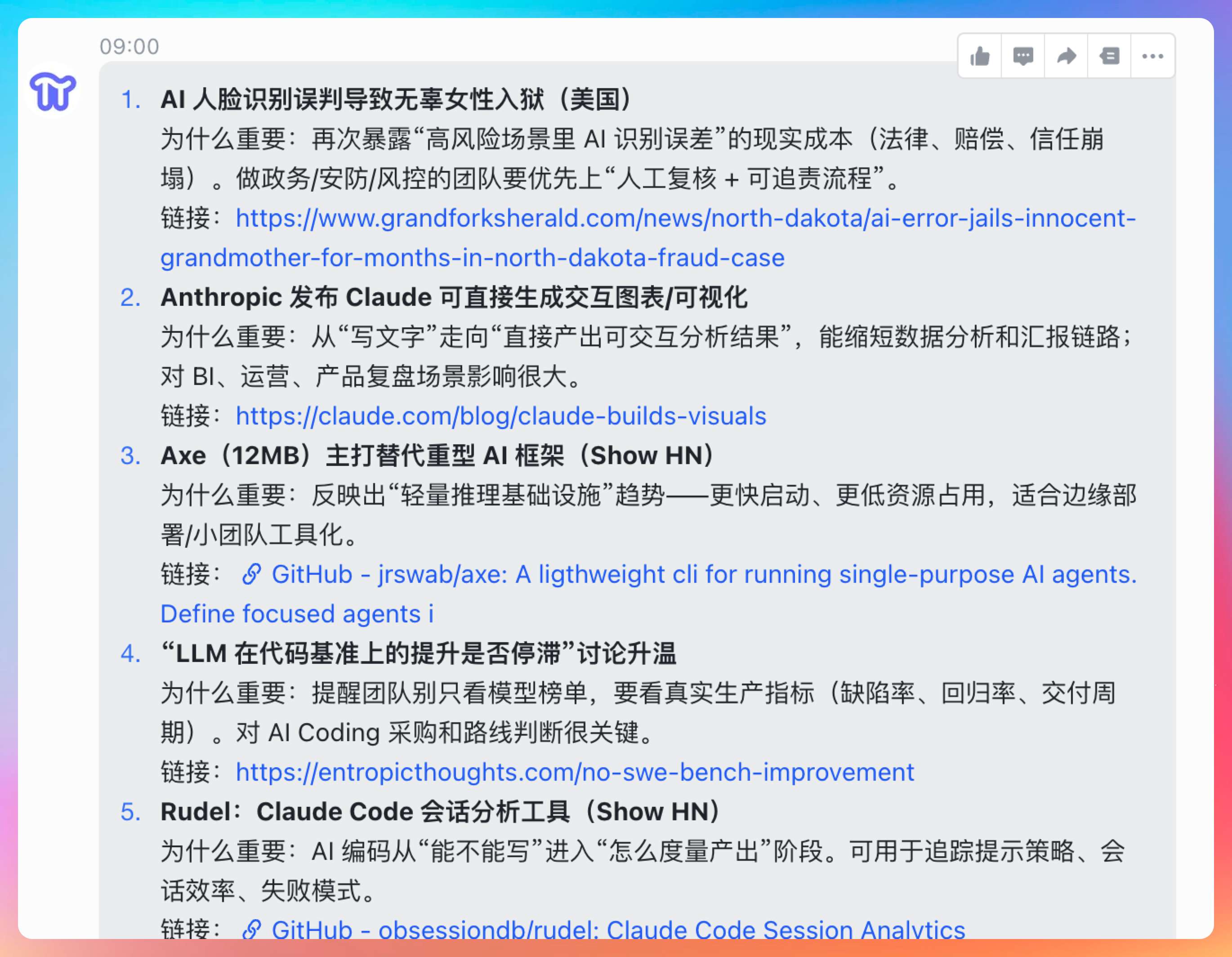 每天早上 9 点帮我盯一下 hacknews 上有趣的 AI 讯息,整理几条发给我。